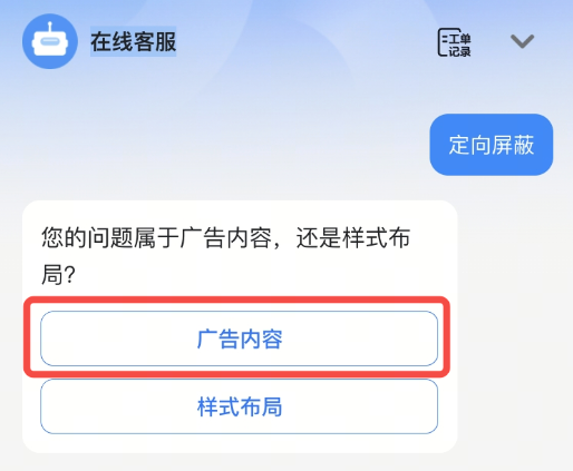 用户日常反馈广告素材体验问题,需沟通处理,为提升处理效率和用户体验,开发者可通过智能客服使用【定向屏蔽】功能精准定位问题素材进行屏蔽,自助高效解决广告素材问题。