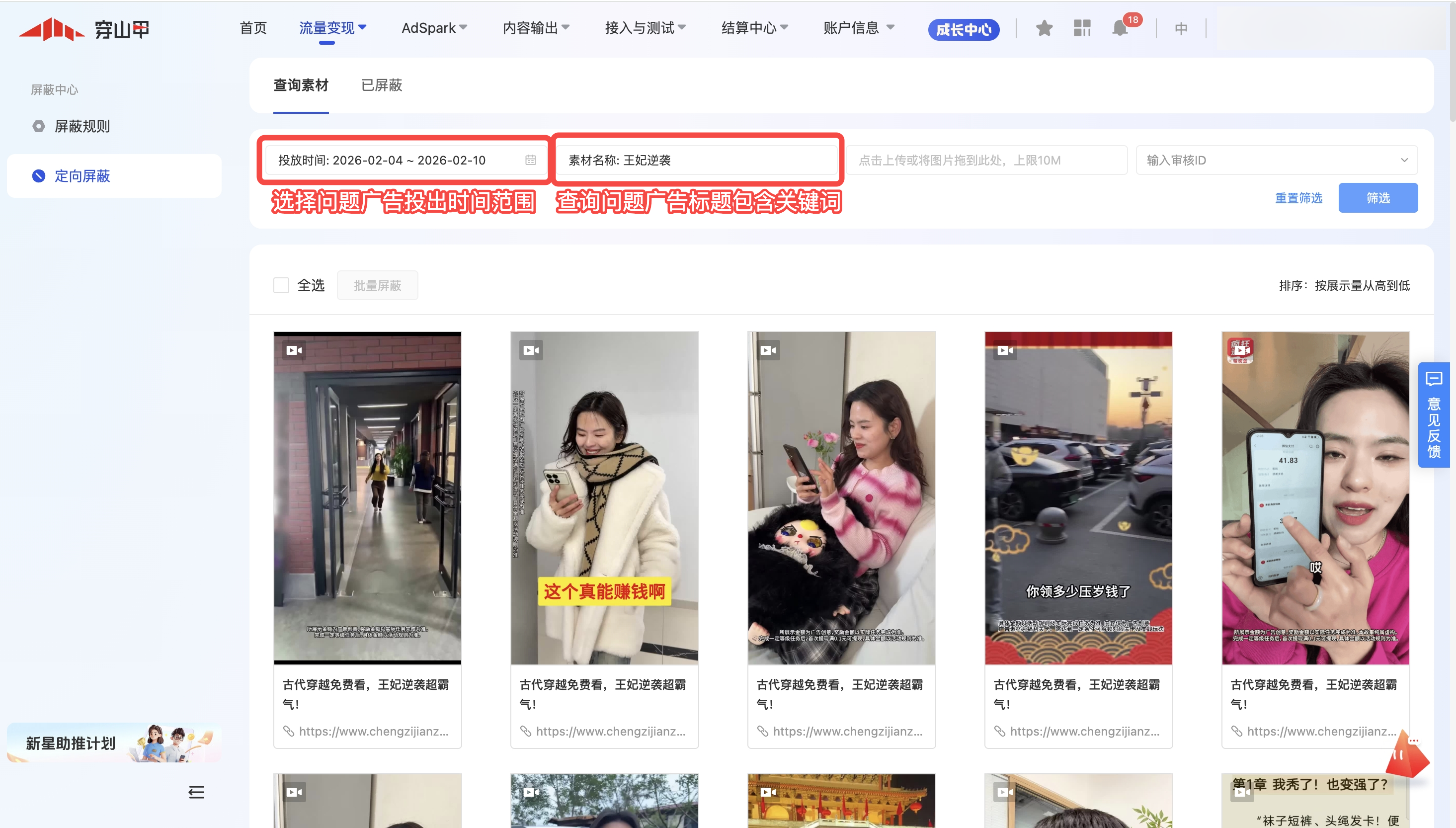 步骤五:选择问题素材投出时间范围,搜索问题广告素材,有两种方式 :