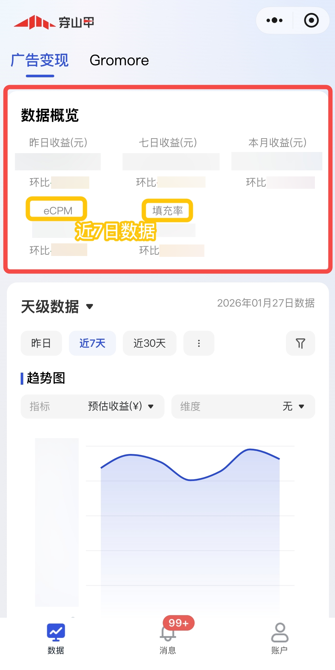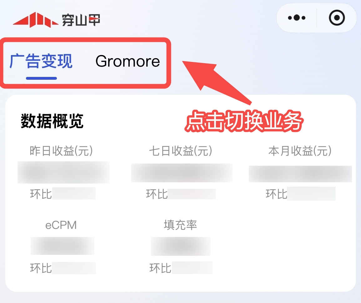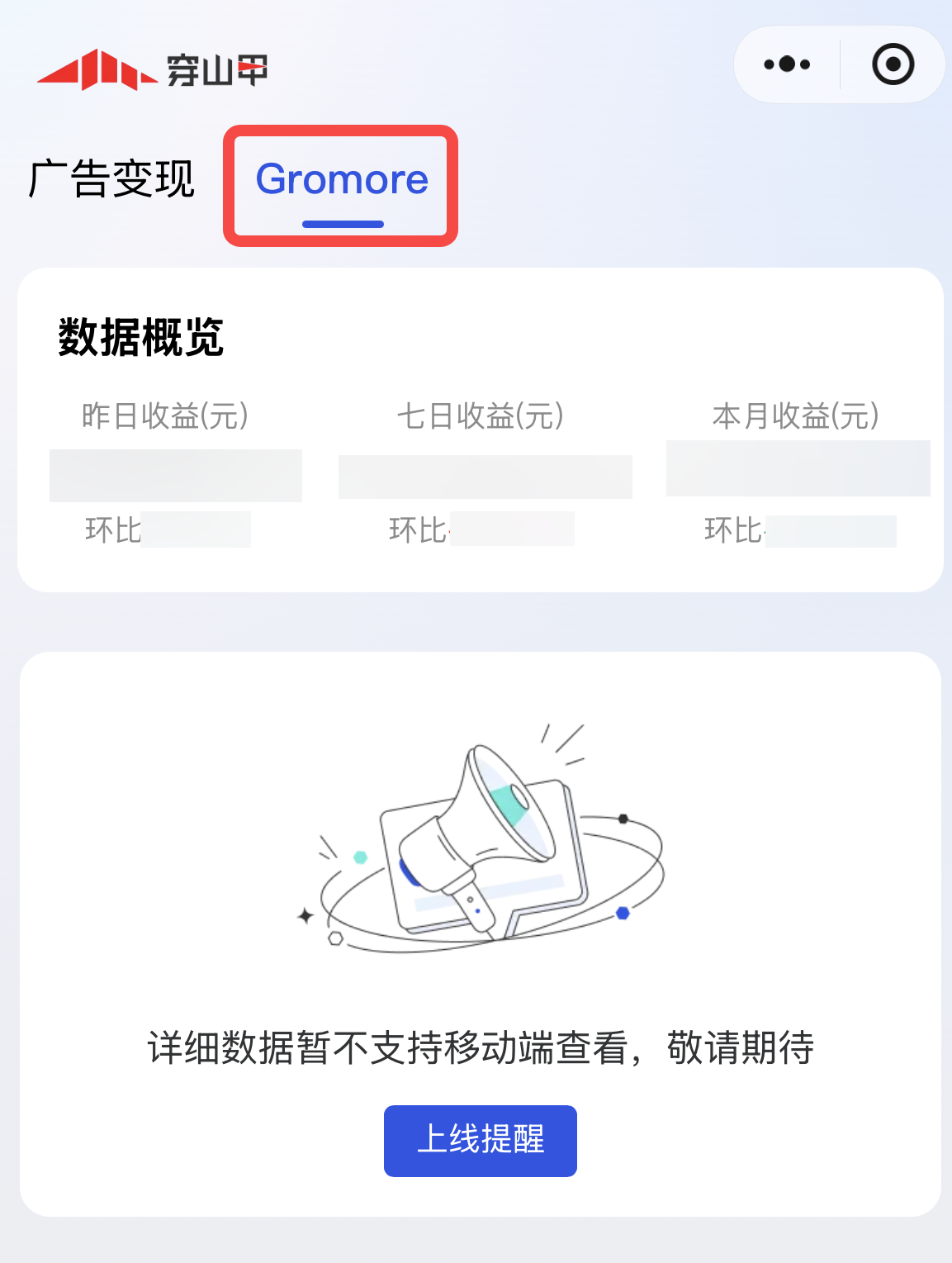 目前 Gromore 页面仅支持查看数据概览,暂不支持查看明细,如有需要可从「PC端平台-流量变现-Gromore-数据报表」查看。目前 Gromore 页面仅支持查看数据概览,暂不支持查看明细,如有需要可从「PC端平台-流量变现-Gromore-数据报表」查看。