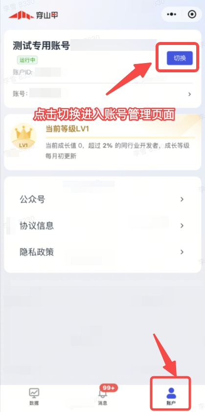 小程序右下角的「账户」模块,支持开发者在移动场景下同时管理多个账户,大大提高管理效率,轻松实现多账户之间的快速切换,实现多元化的移动端变现布局。操作方法如下: