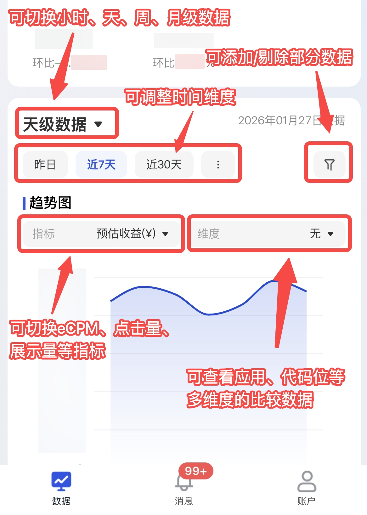 「穿山甲小程序」是一款集 数据监控、消息通知、多账户管理 于一体的移动端工具,帮助开发者随时随地掌握业务动态,实现高效的移动端变现管理。