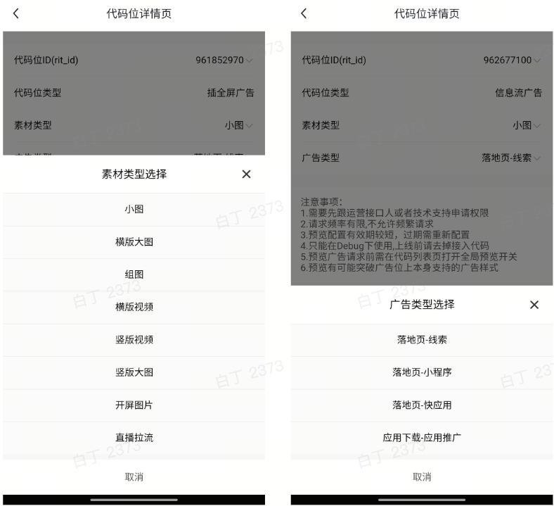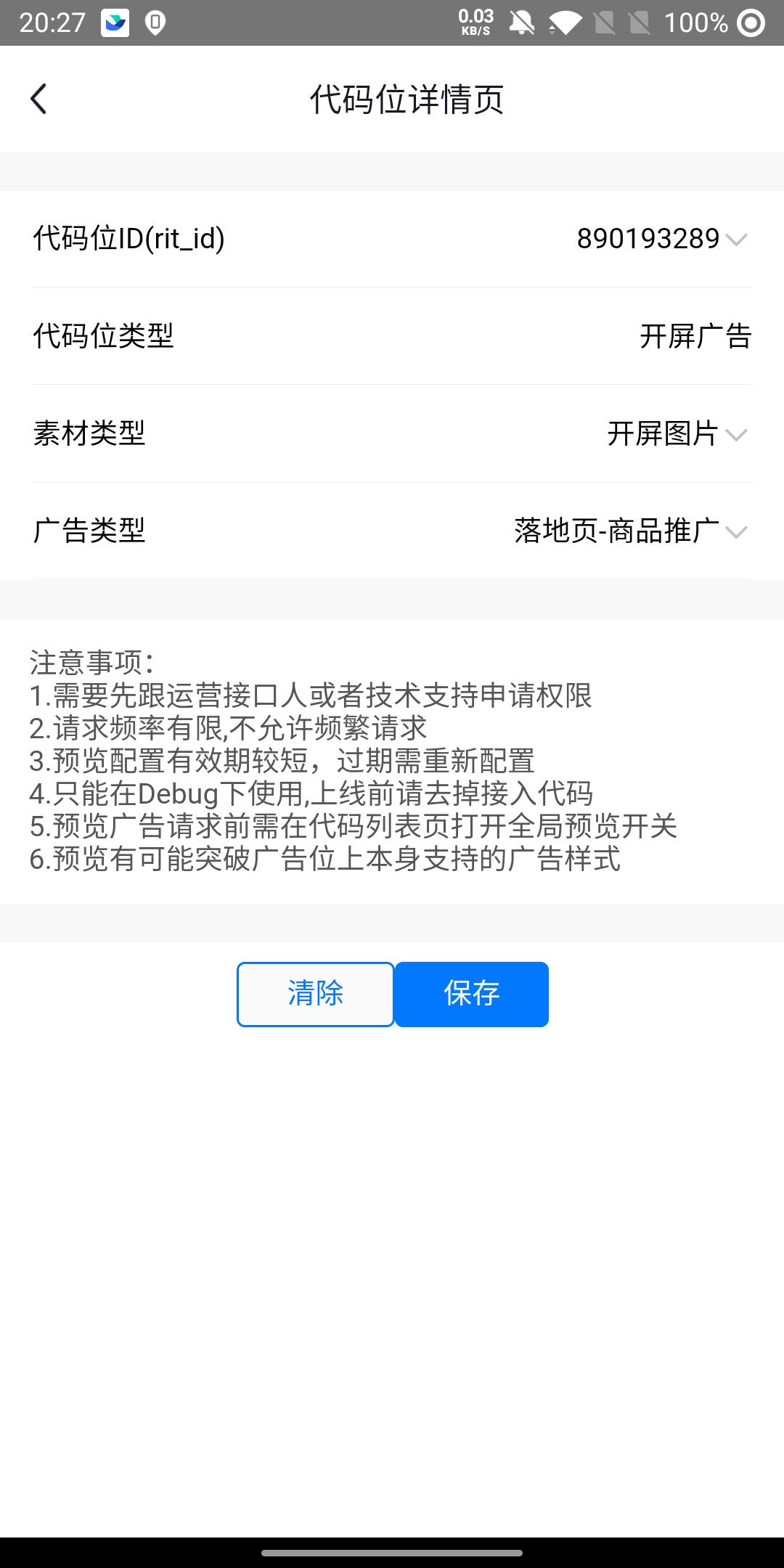 代码位详情页:可查看当前代码位类型、素材类型、广告类型。可清除或保存更改的预览类型。 | |
