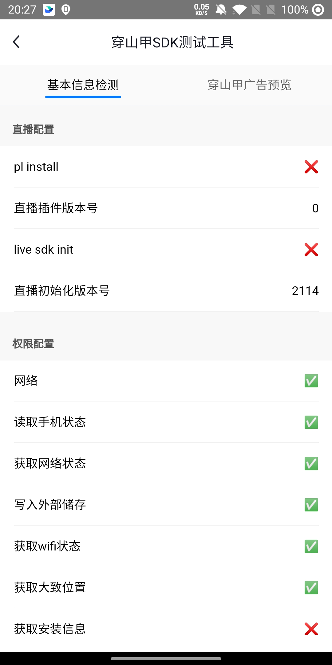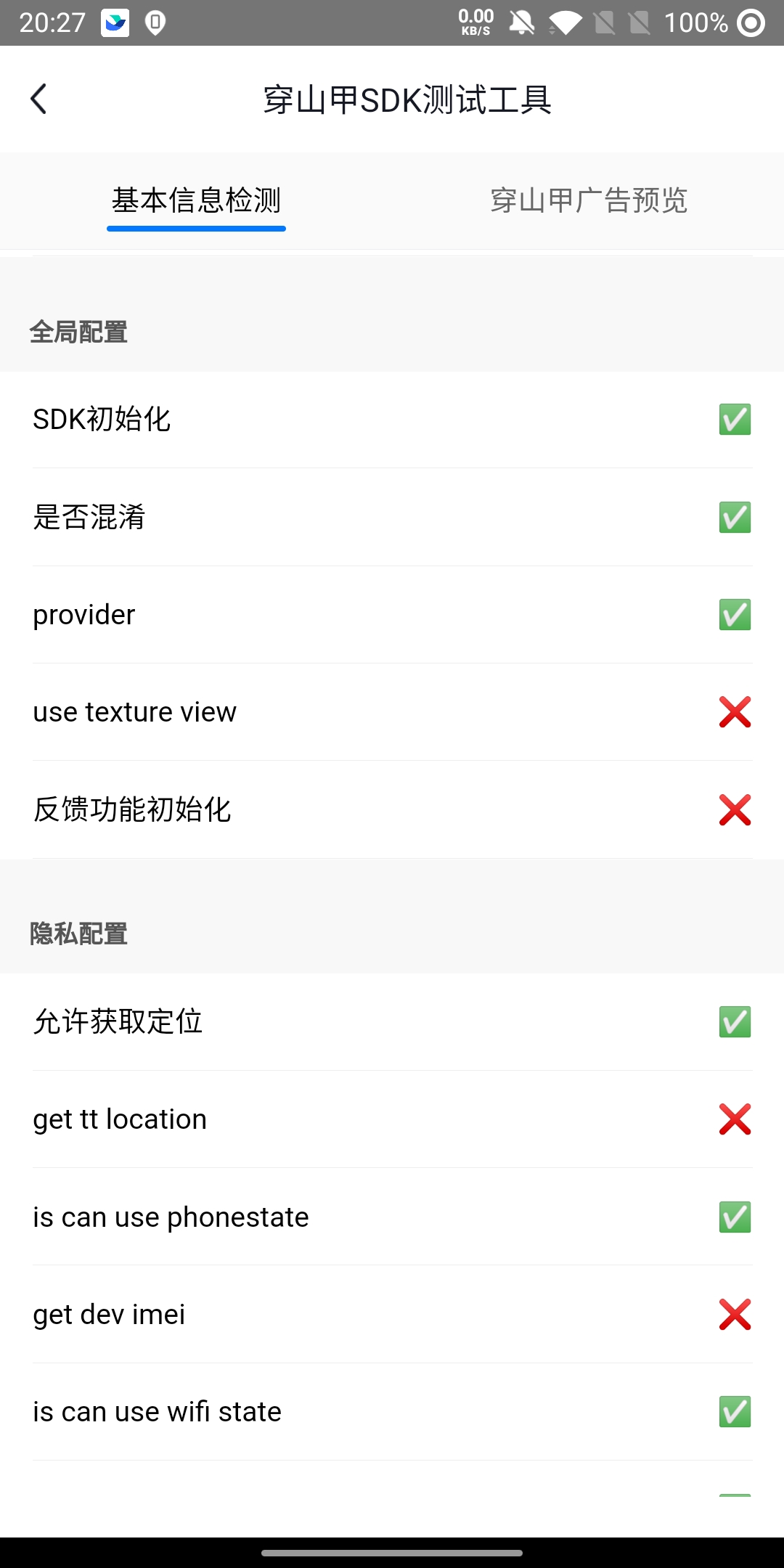 // 68版本pod方式 pod 'BUAdTestMeasurement', '6.8.xx' // 69版本pod方式 pod 'Ads-CN-Beta','6.9.xx', :subspecs => ['BUAdSDK', 'BUAdTestMeasurement']进入测试工具首页,即可进行基础信息检测,在此页面可查看应用、设备、接入的SDK的相关信息,开发者可根据显示信息检测接入信息是否正确。