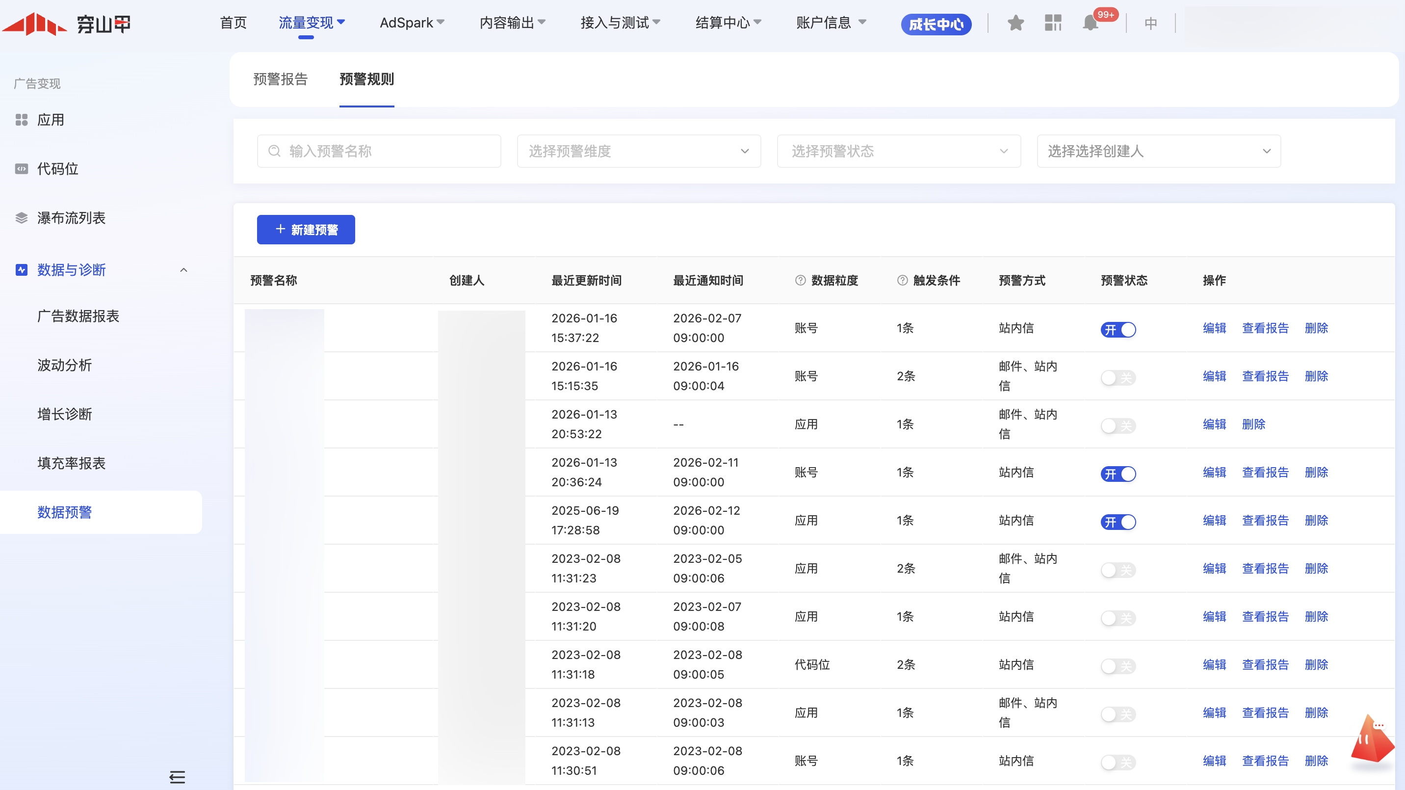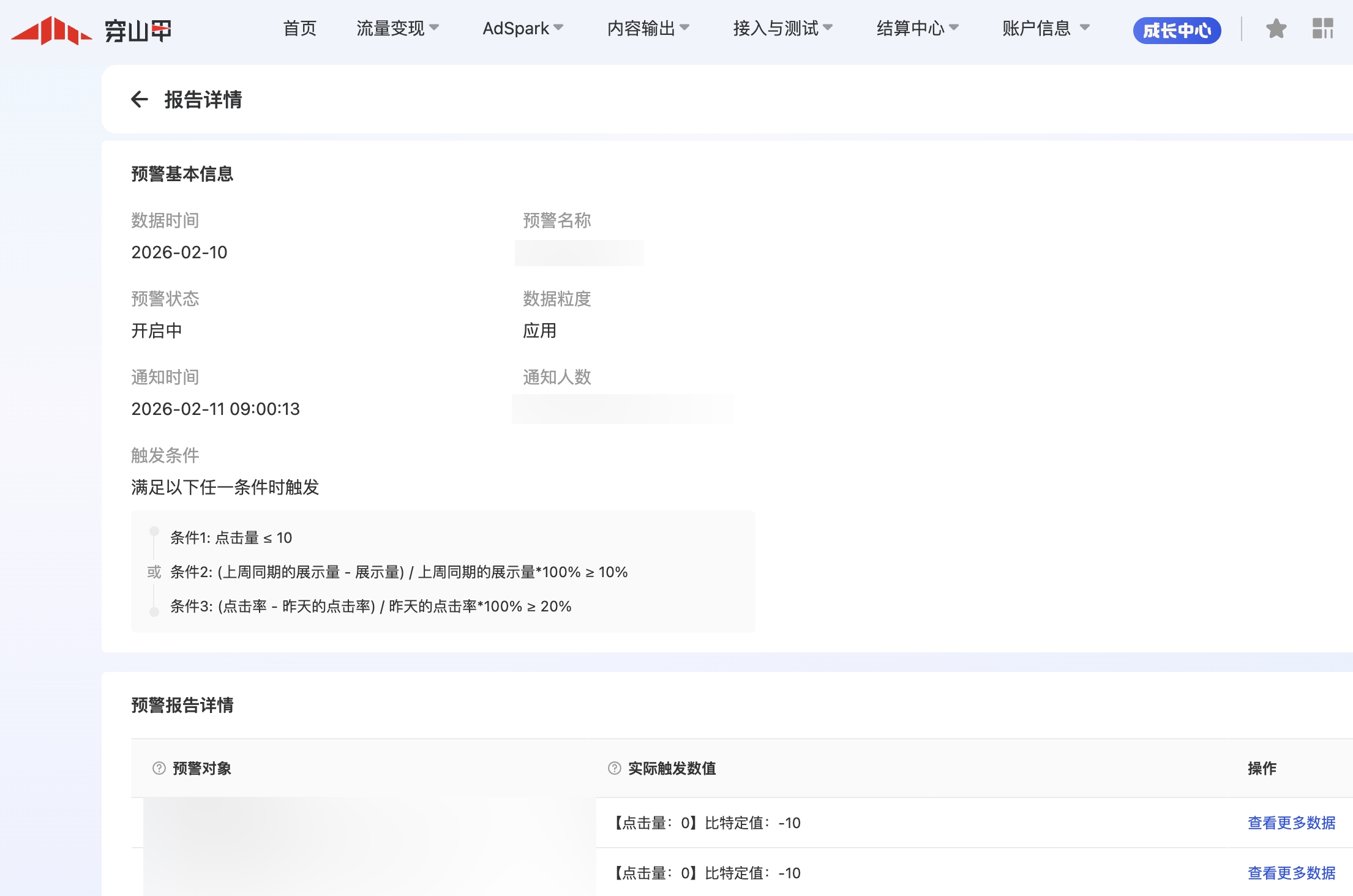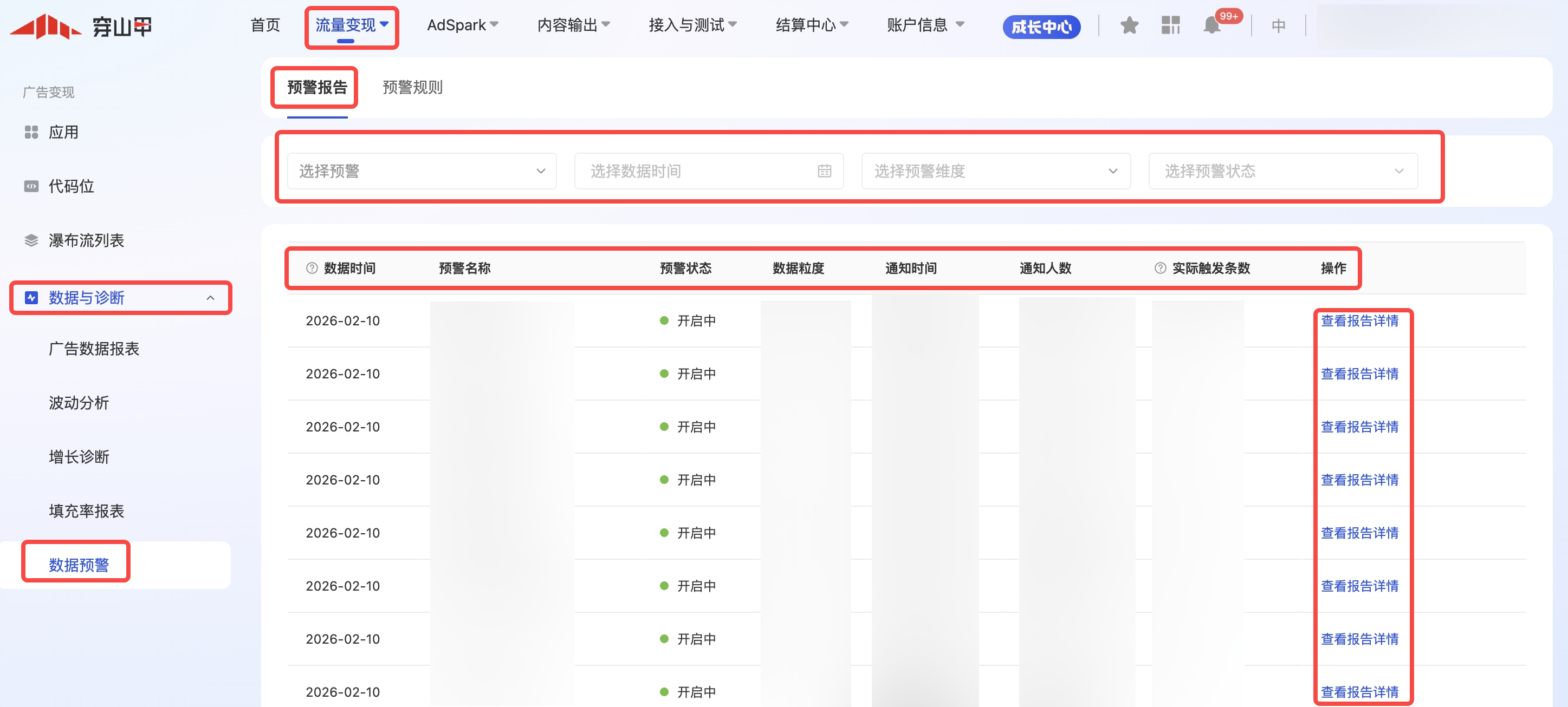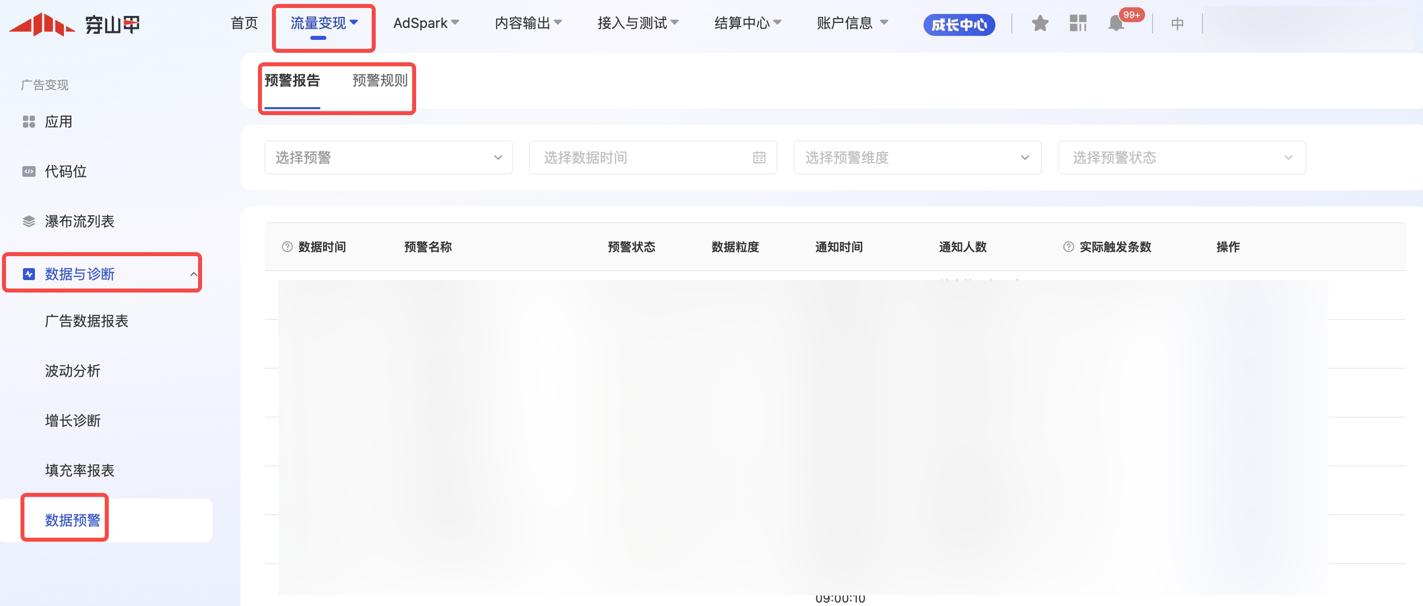 「流量变现」-「广告变现」-「数据与诊断」-「数据预警」