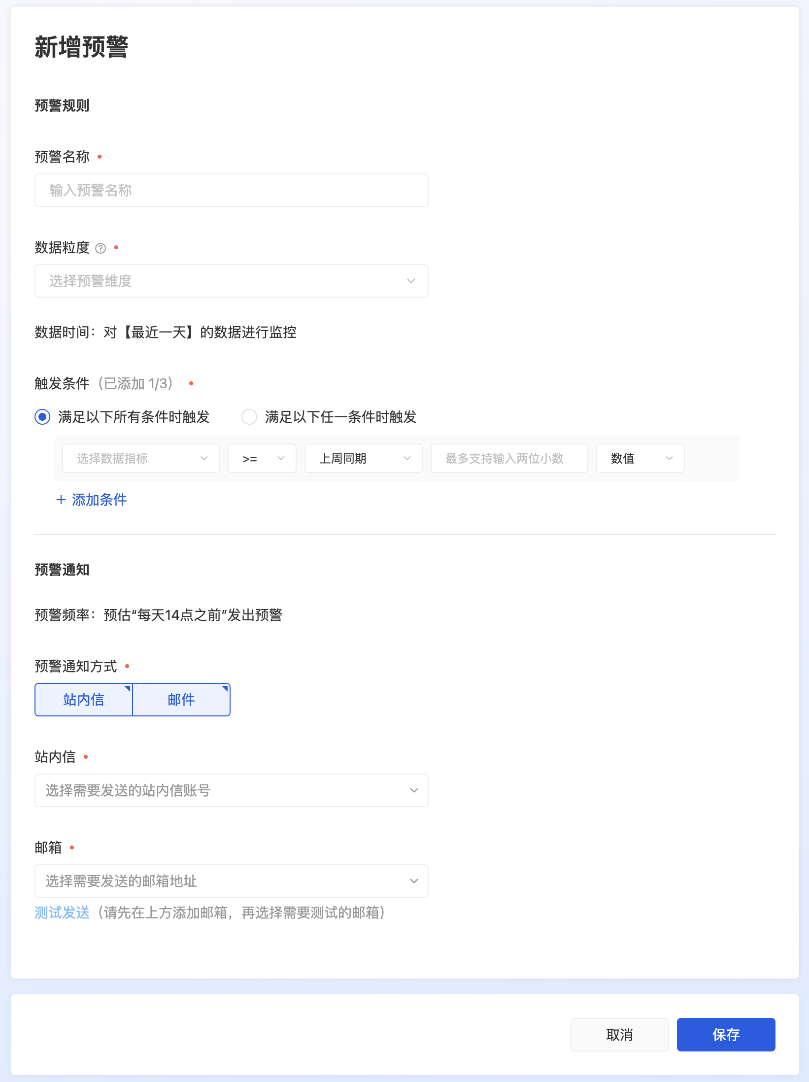 在「预警规则」页面点击新建预警,则进入新建预警页面。开发者通过设置想要的触发条件、通知方式,完成数据预警的创建过程,一个账号最多可创建 20 条 数据预警(指处于开启状态的规则)。