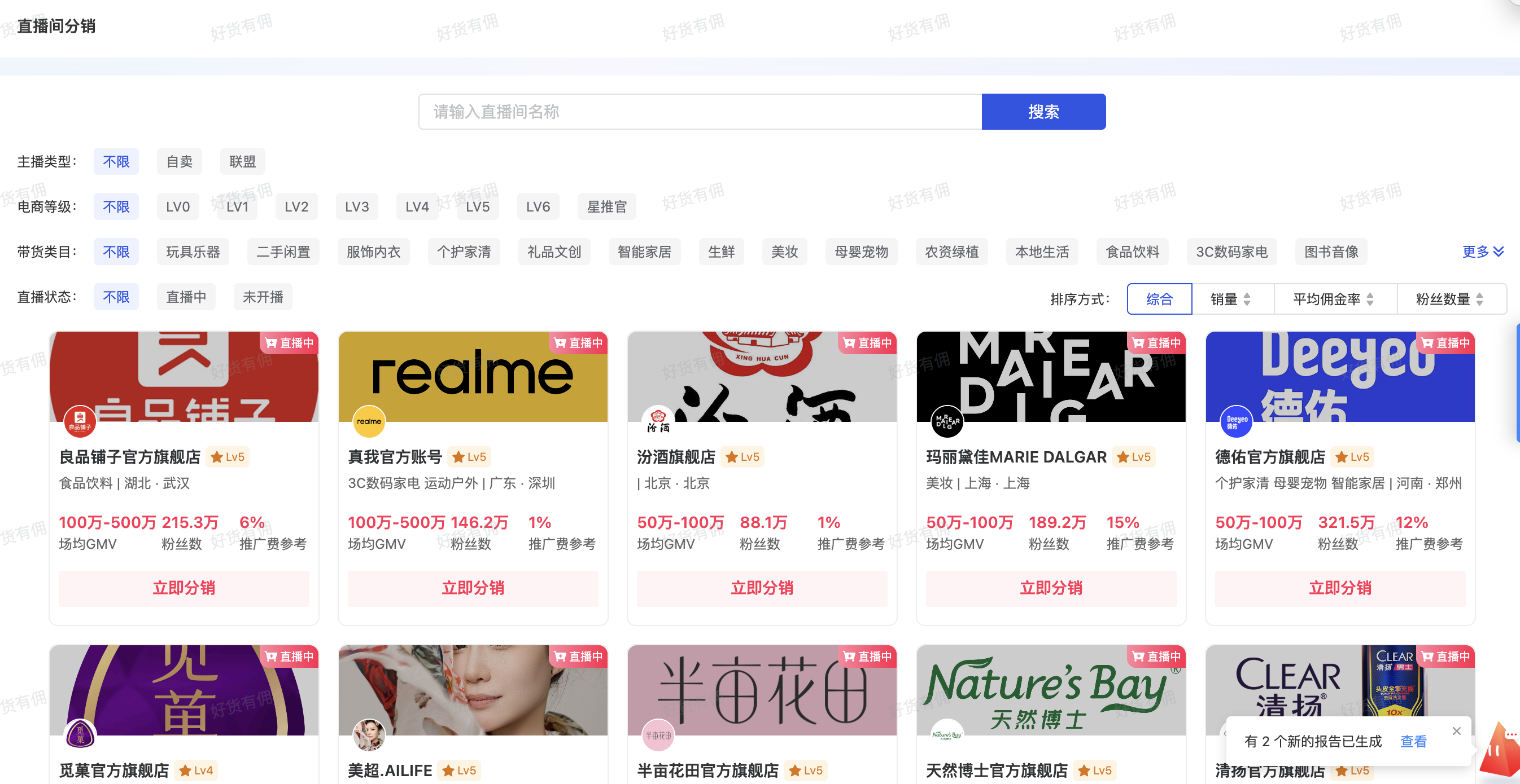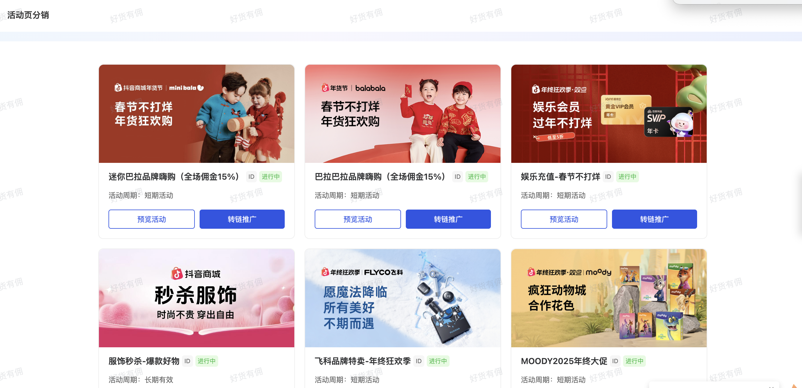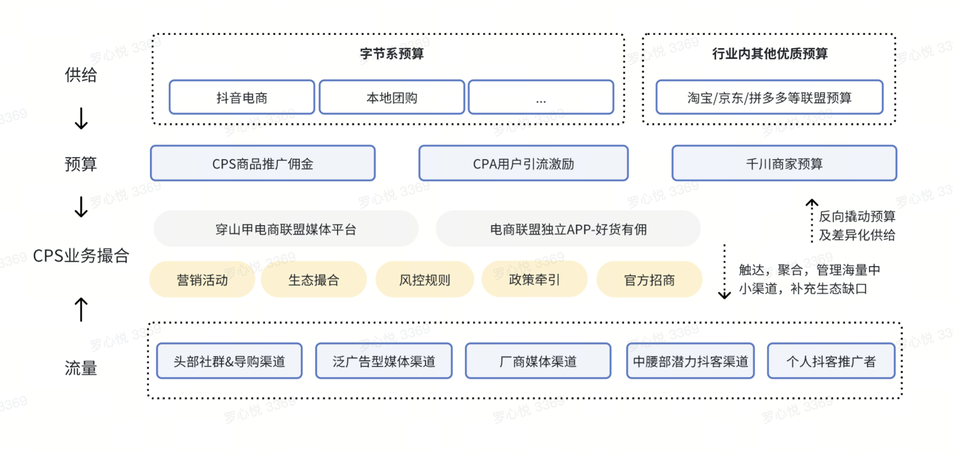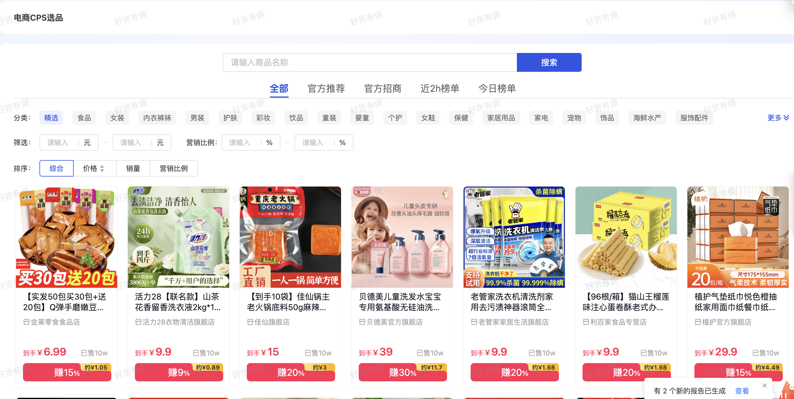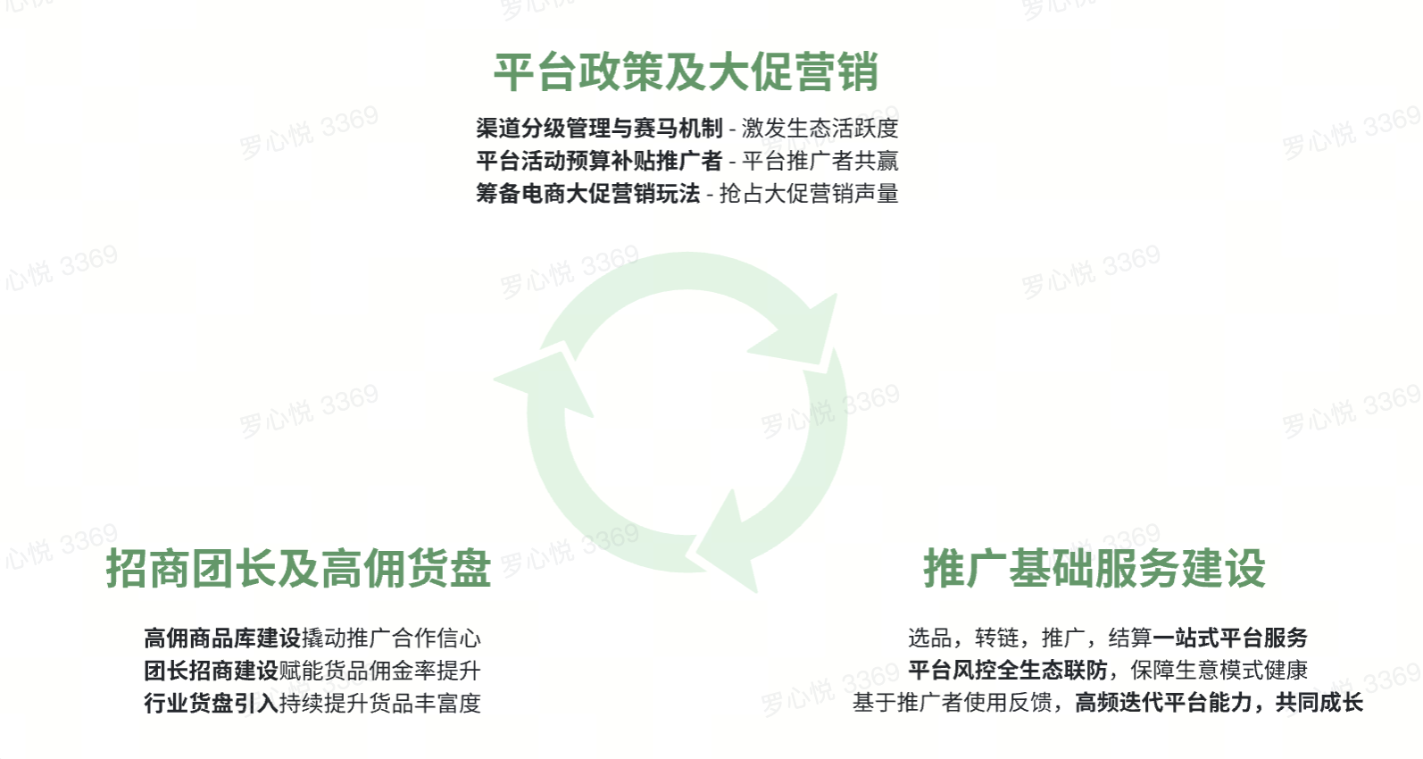 通过平台政策,渠道及招商玩法,为下游中小渠道提供的包括选品、转链、分发等在内的推广基础服务撬动商品成交,搭建商家与渠道之间的生意桥梁。