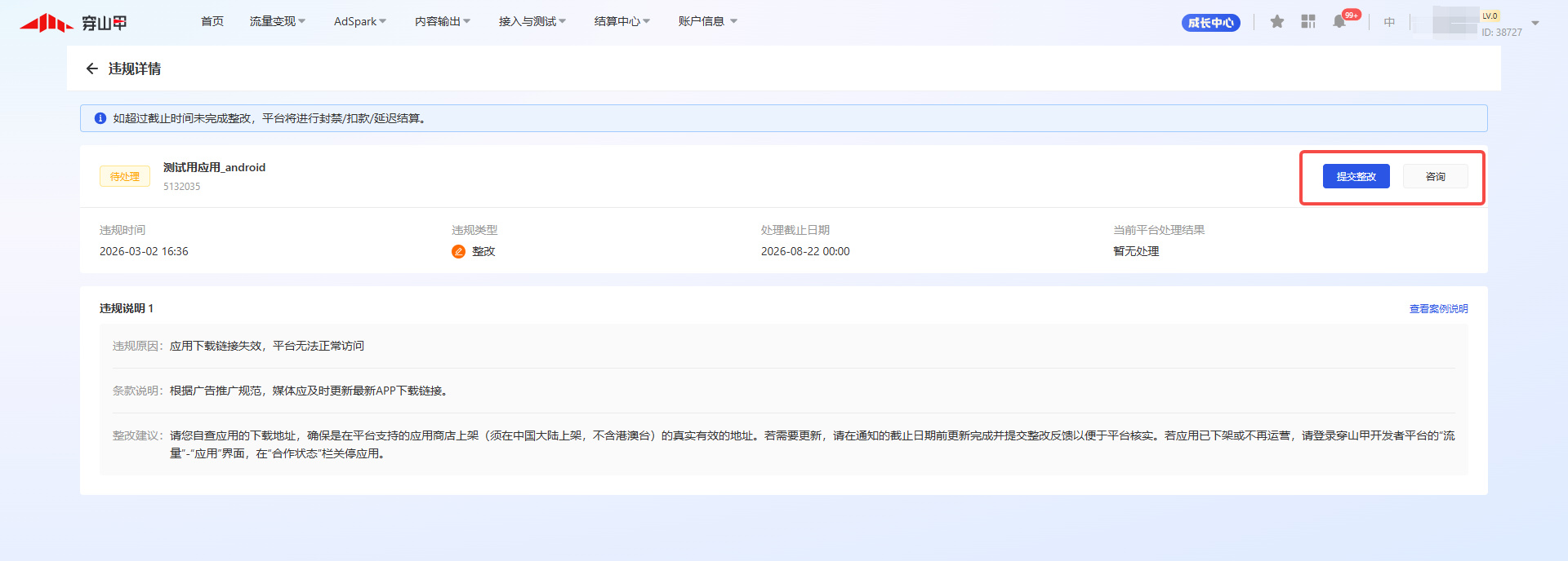 (1)如发现其他违规行为,穿山甲平台会向开发者发送整改邮件。开发者需要在7个工作日内通过【穿山甲平台-合规中心】的整改入口提供整改方案并完成整改,穿山甲平台将在7个工作日内完成复查并给予回复。如开发者未在7个工作日内答复并完成整改,将会影响相关代码位/应用/账号的广告收益及状态,请及时关注整改逾期提示(右上角的红色角标)。