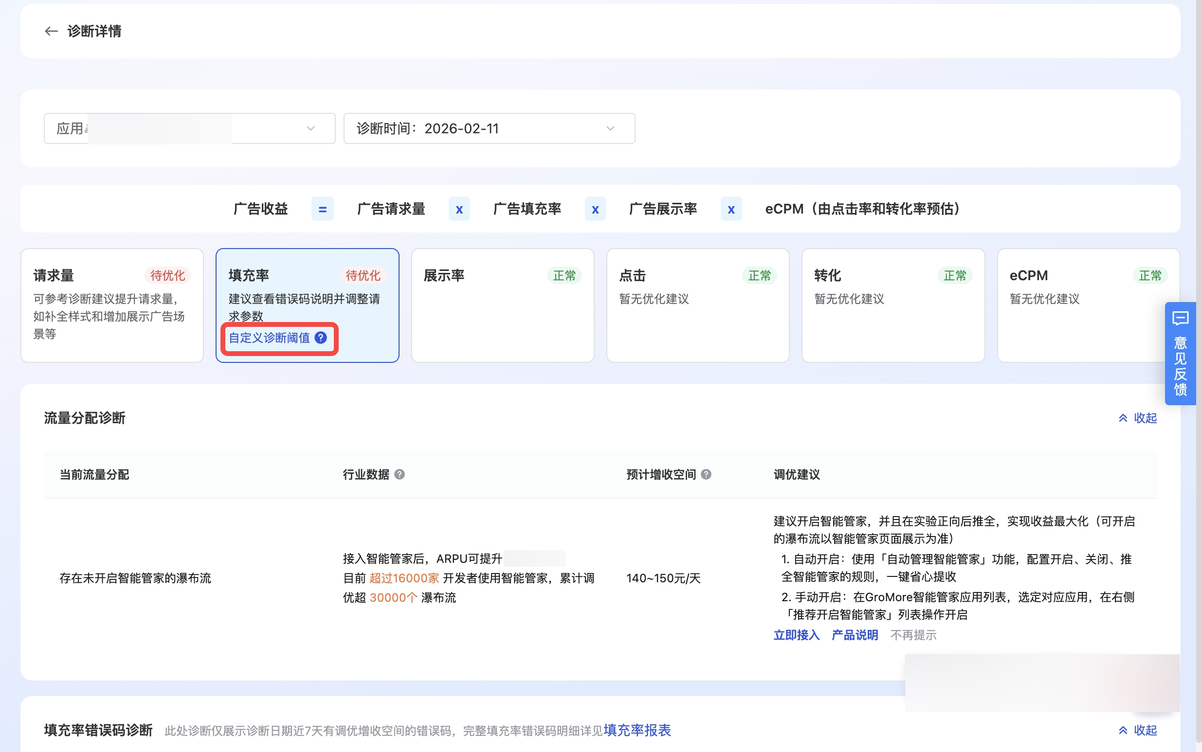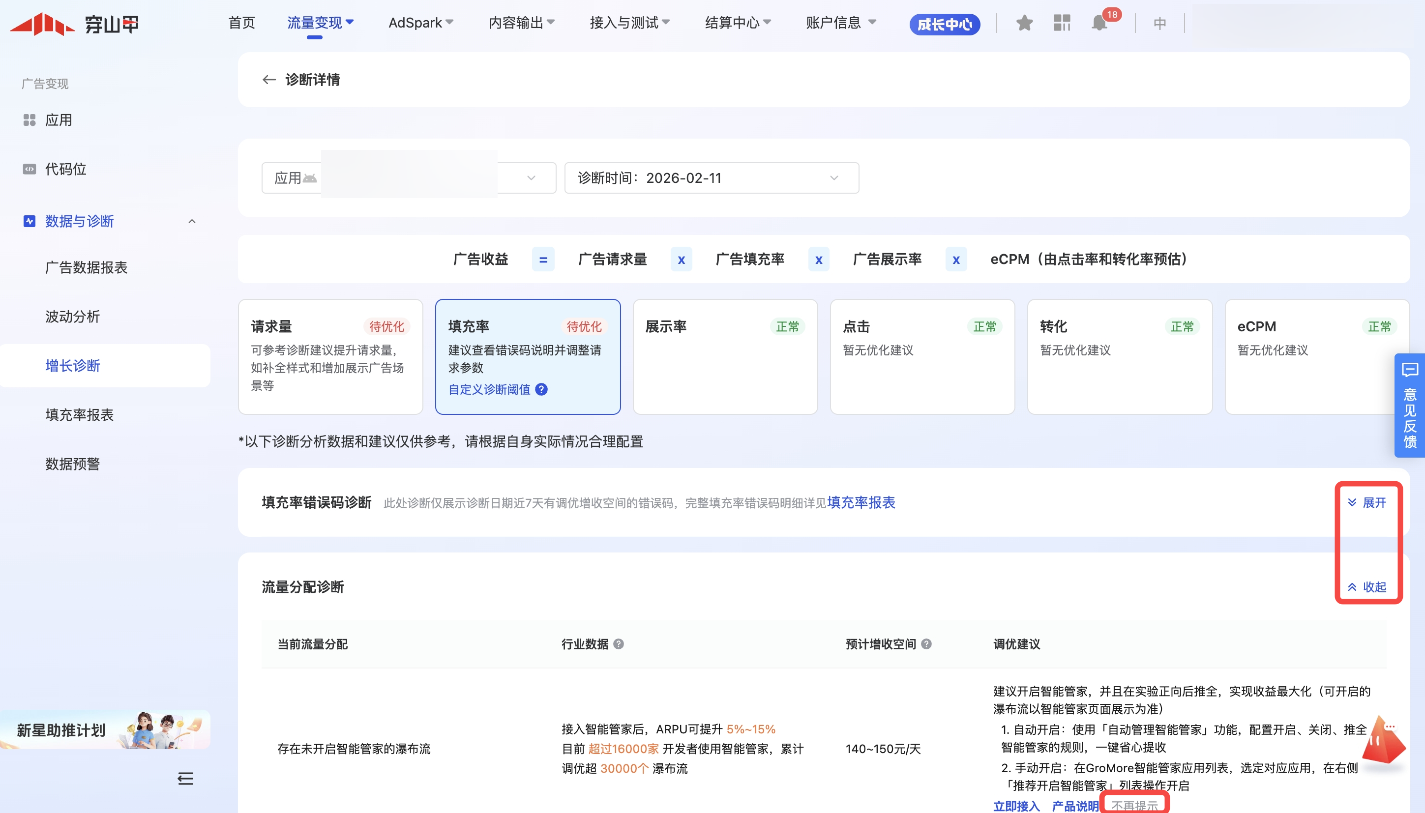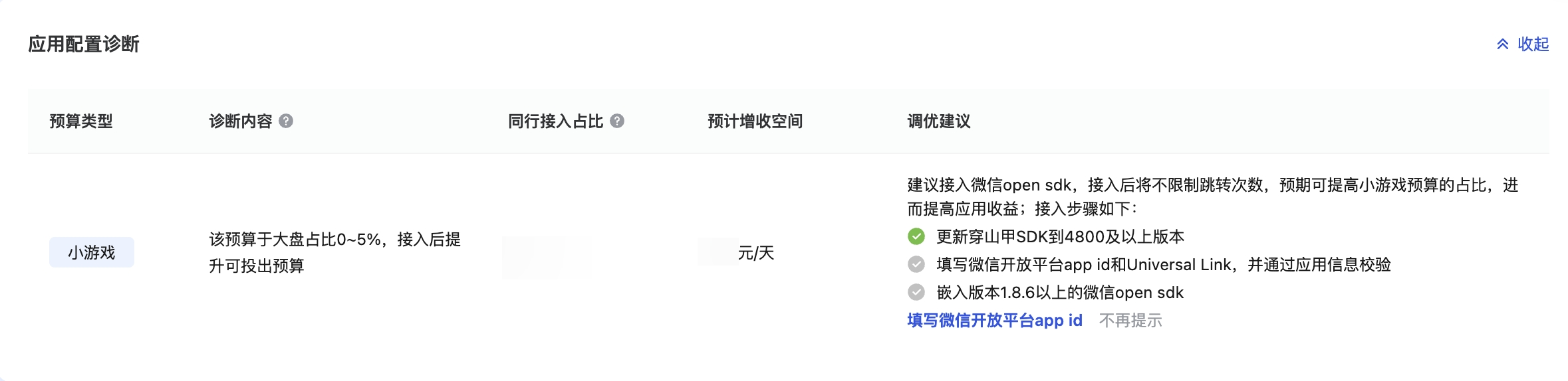 增长诊断工具是系统通过穿山甲整体变现配置情况和自身应用对比,产出可提升收入的诊断建议。例如穿山甲大盘有过半的开发者完成了某项配置,且该配置对收益有正向效果,则增长诊断会产出推荐尚未完成该配置的开发者尽快配置。
