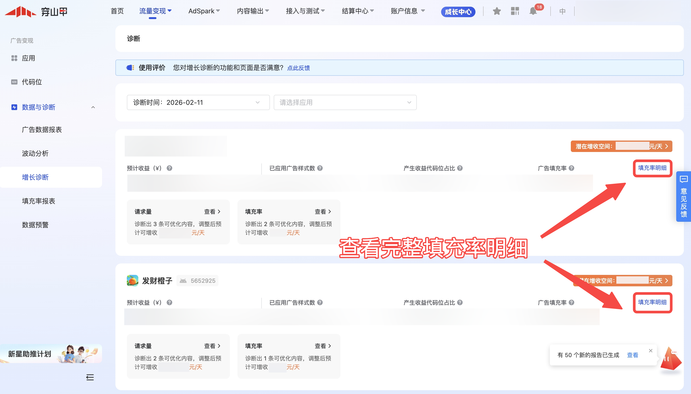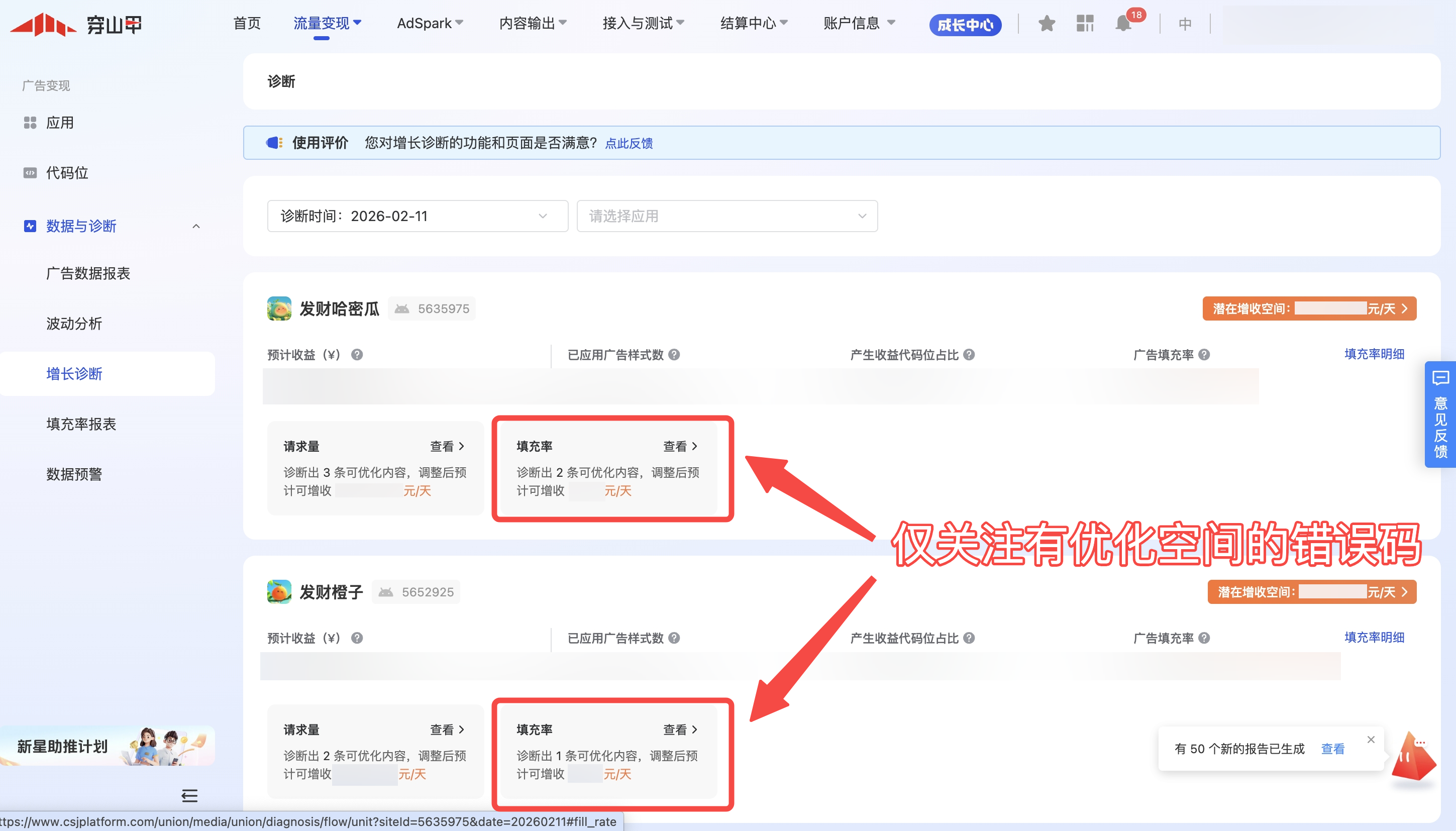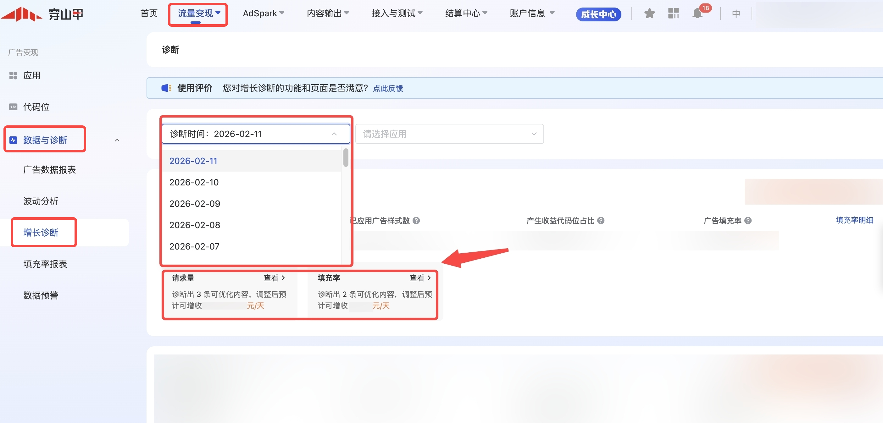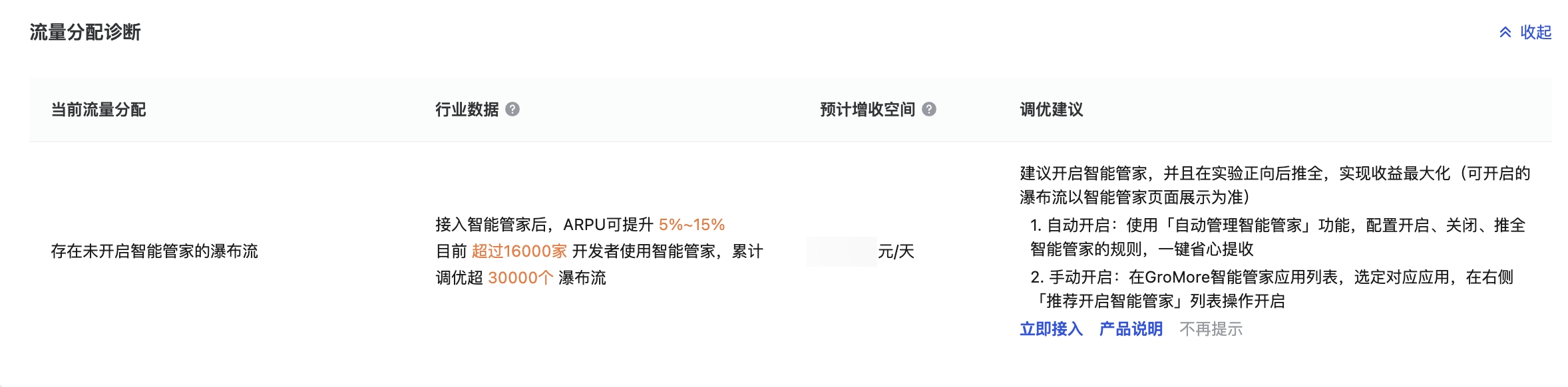 增长诊断工具是系统通过穿山甲整体变现配置情况和自身应用对比,产出可提升收入的诊断建议。例如穿山甲大盘有过半的开发者完成了某项配置,且该配置对收益有正向效果,则增长诊断会产出推荐尚未完成该配置的开发者尽快配置。