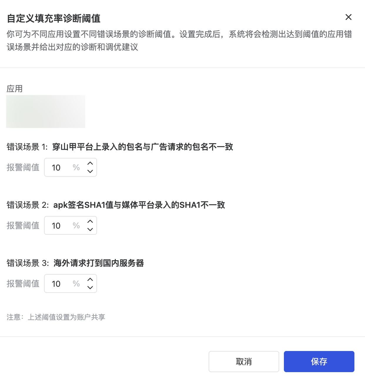 填充率诊断支持对 3 类错误码设置诊断阈值。设置完成后,系统会自动识别达到阈值的应用错误场景,并提供对应的诊断结果与调优建议。支持配置阈值的错误码包括: