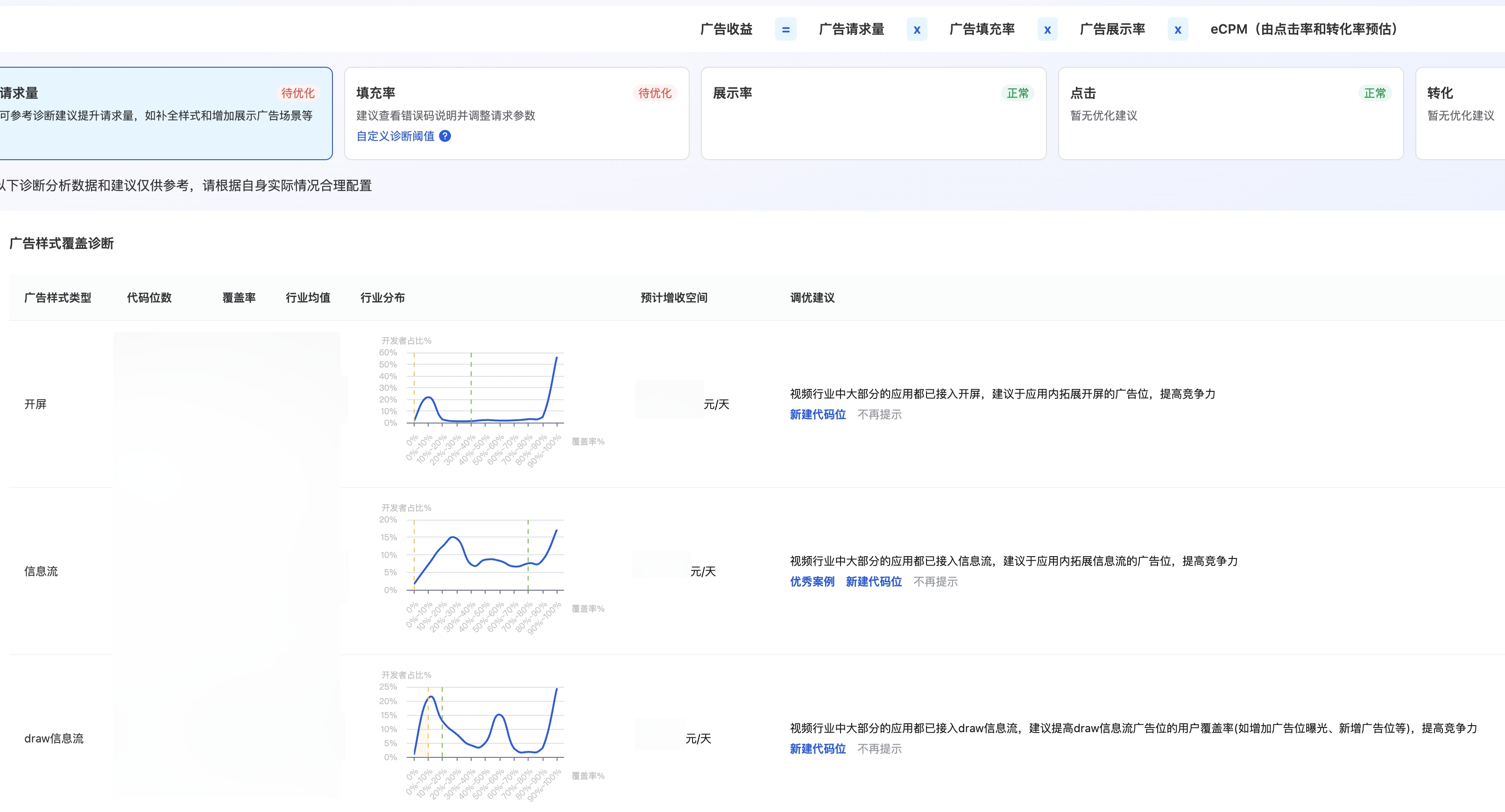 诊断系统会自动对比开发者自身的样式用户覆盖率与行业均值、行业分布,明确增收空间,引导开发者将样式用户覆盖率对齐行业均值与行业标杆,从而提升收入。
