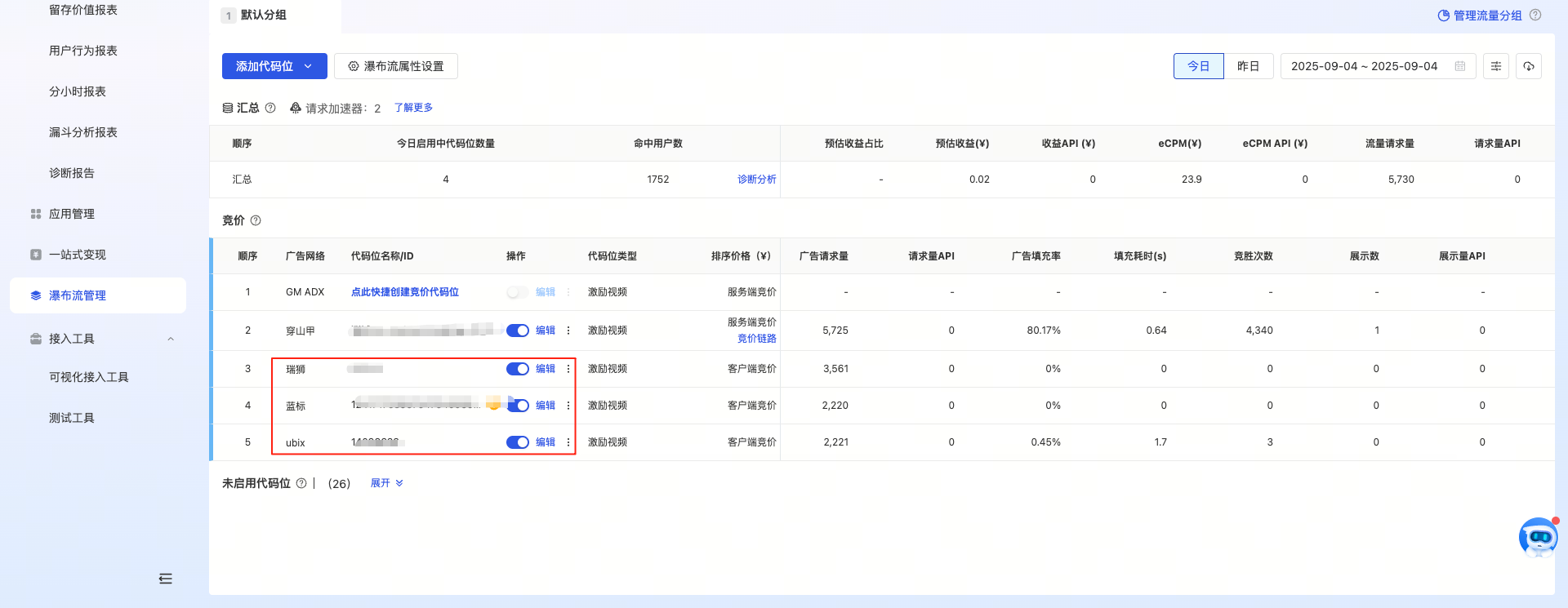 建议小流量测试链路是否通顺,如无问题可正式进行放量如测试结算难刷到对应ADN的素材,可添加测试代码位,但正式上线前需确保已切换为正式广告位,否则将影响收入产生及结算