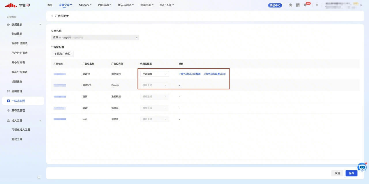 如测试结算难刷到对应ADN的素材,可添加测试代码位,但正式上线前需确保已切换为正式广告位,否则将影