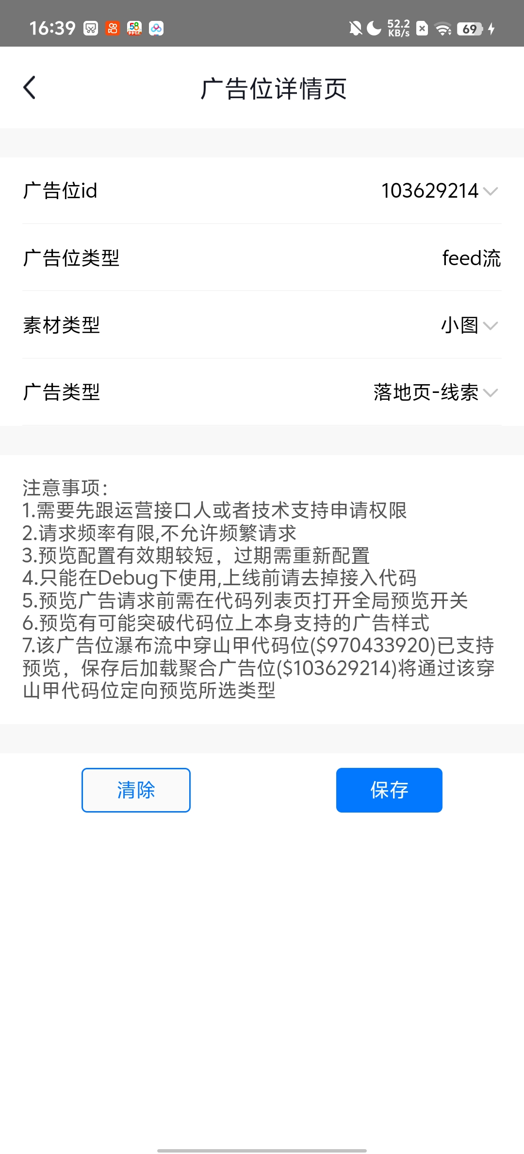 广告位详情页:可查看当前广告位类型、素材类型、广告类型。可清除或保存更改的预览类型。 | |