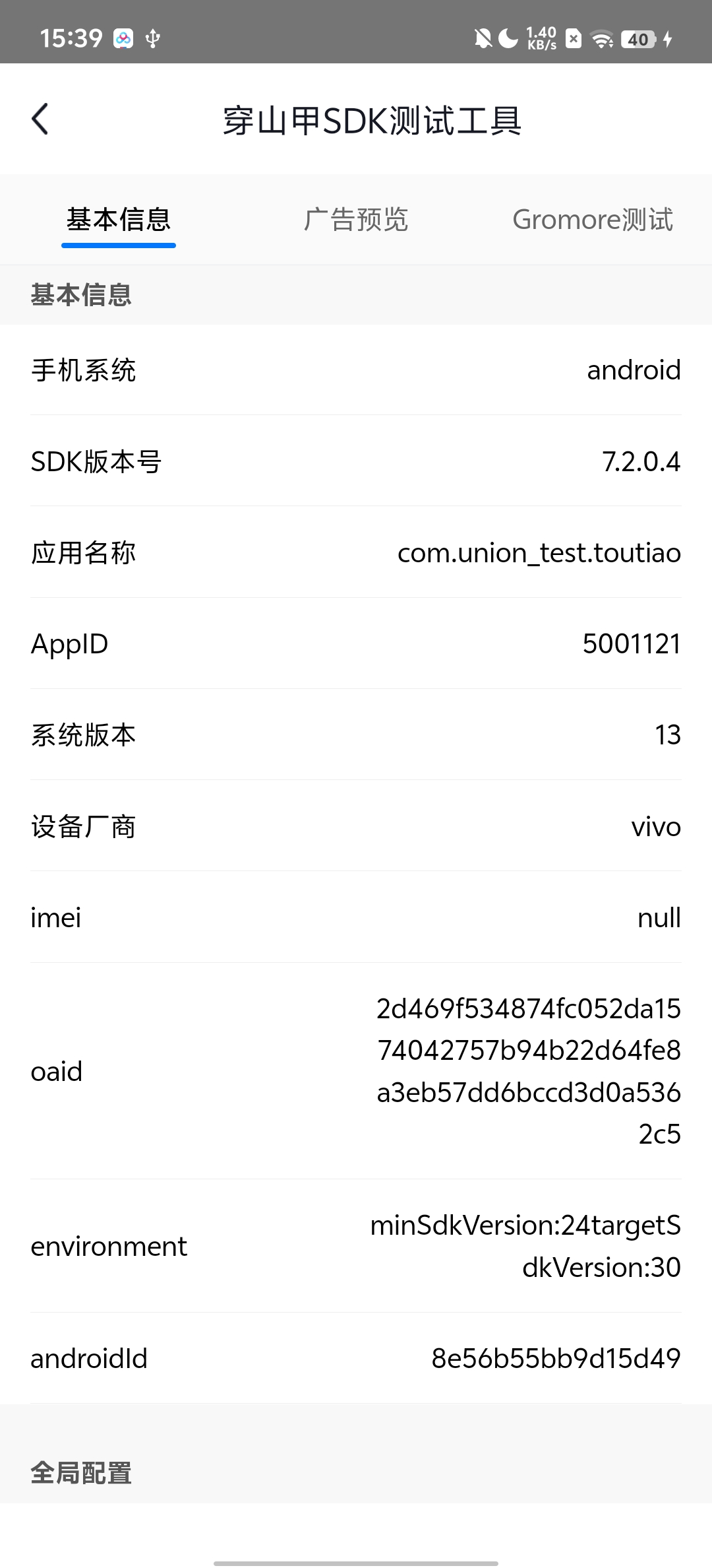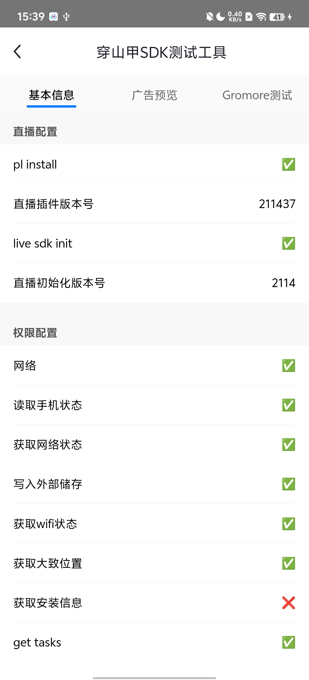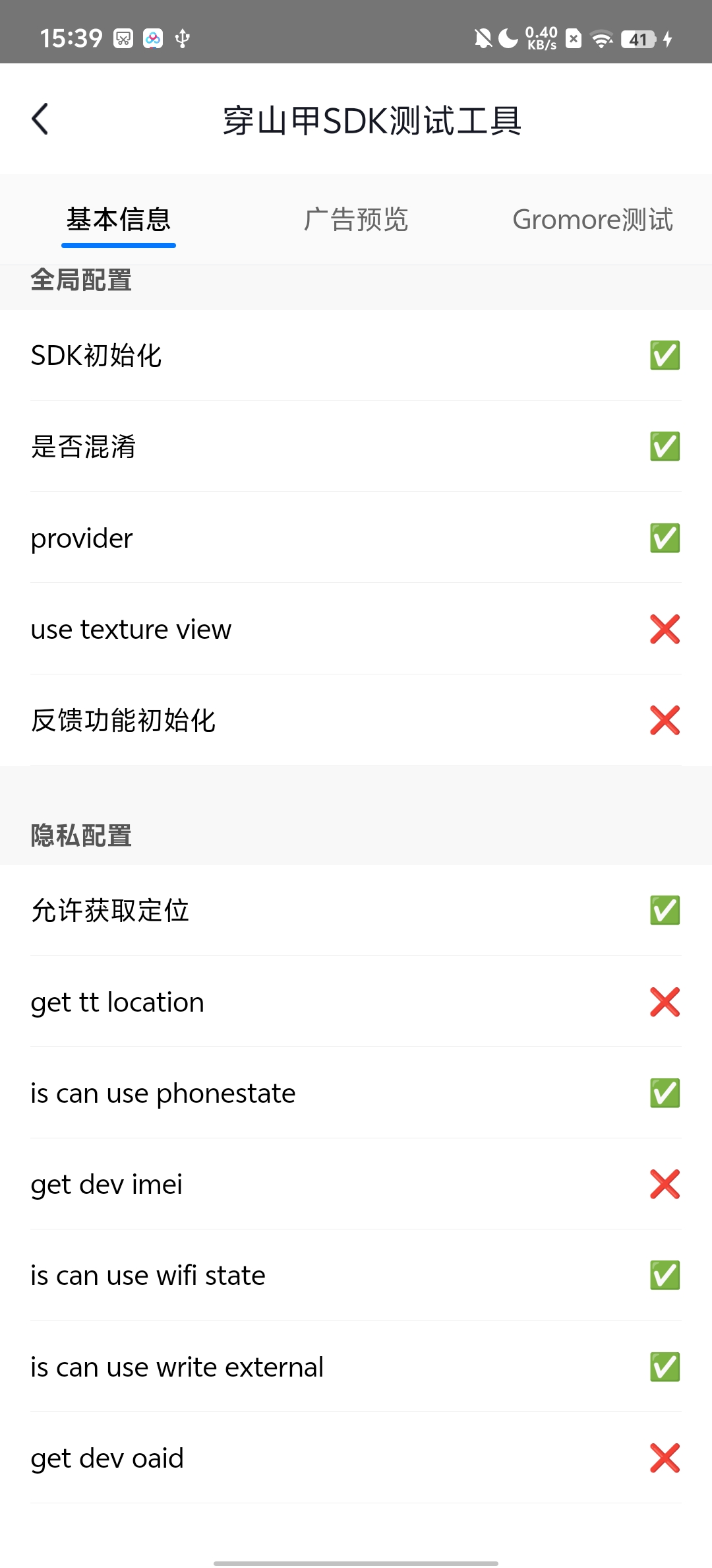 进入测试工具首页,即可进行基础信息检测,在此页面可查看应用、设备、已接入SDK的相关信息,开发者可根据显示信息检测接入信息是否正确。