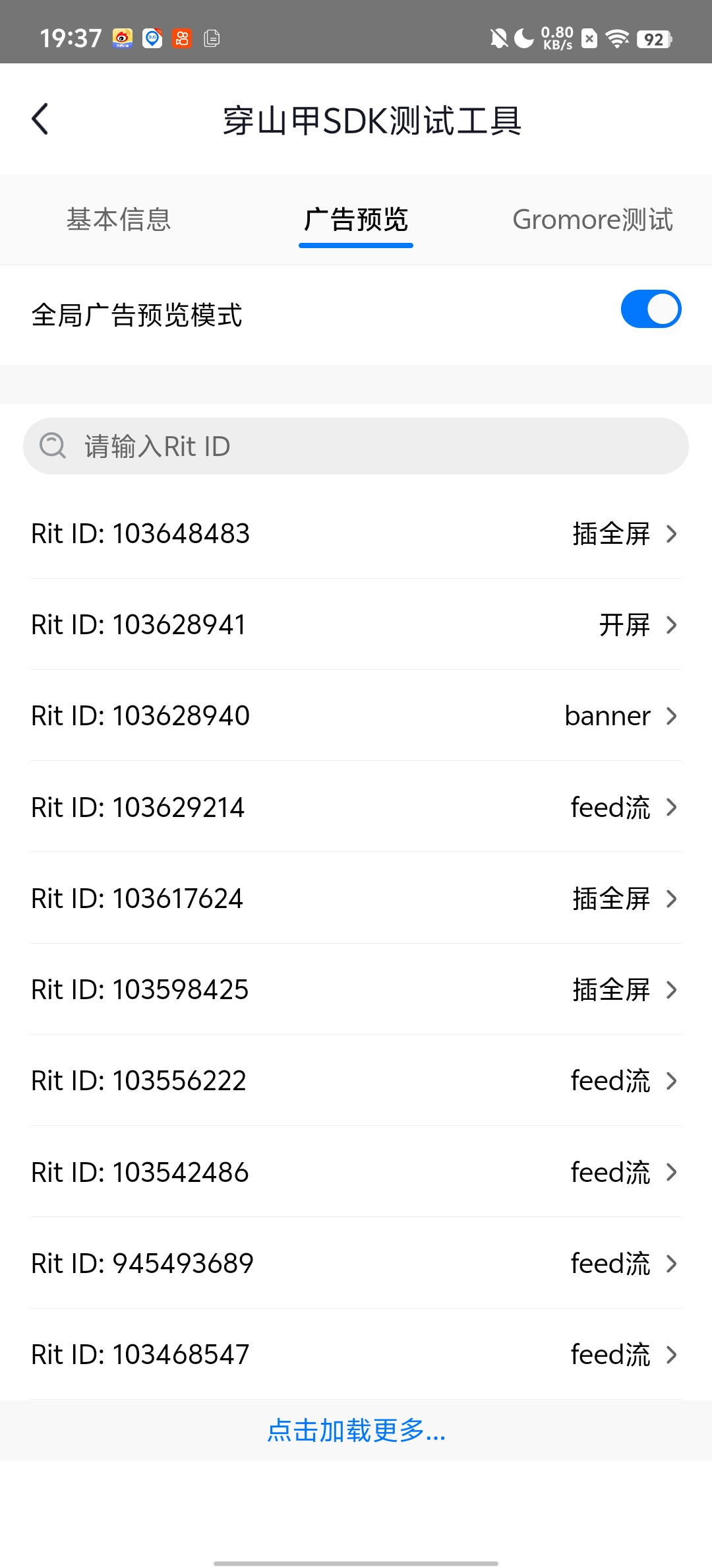 在预览测试工具中打开全局广告预览模式开关,并配置好需要预览的广告后。可以调用广告load方法加载广告。具体可查看SDK接入文档。