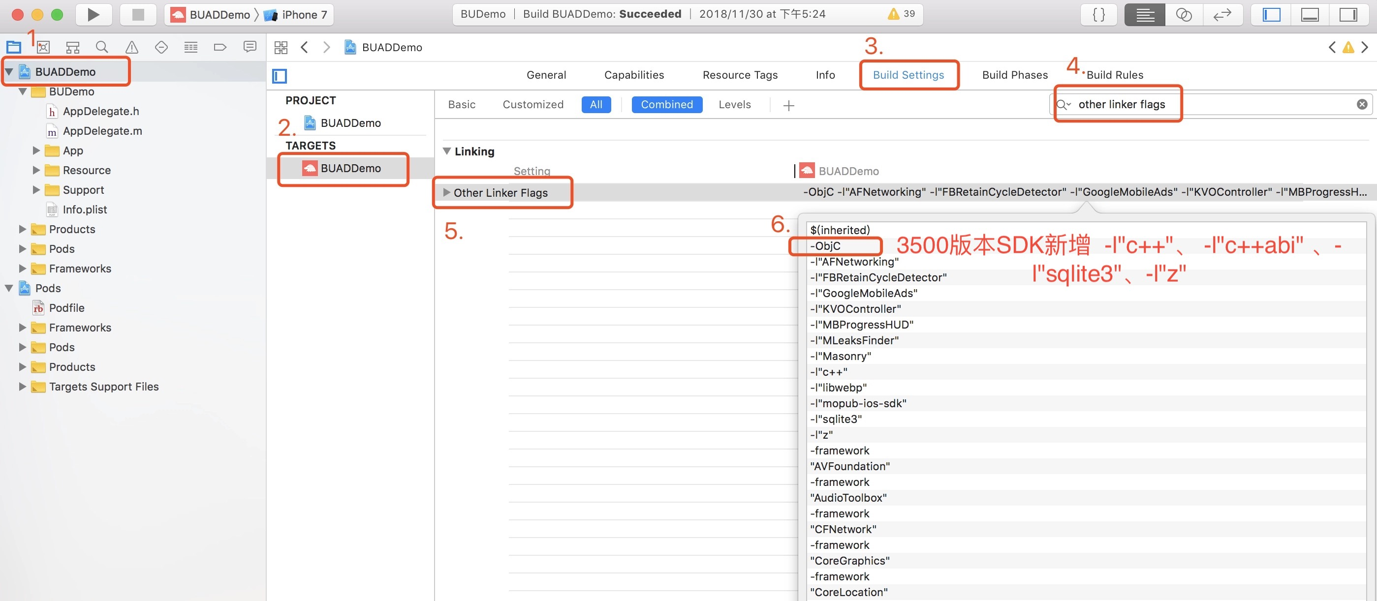 选中项目,在Build Settings->Other Linker Flags 增加参数-ObjC、 -l"c++"、 -l"c++abi" 、-l"sqlite3"、-l"z" ,SDK同时支持-all_load,具体操作如图: