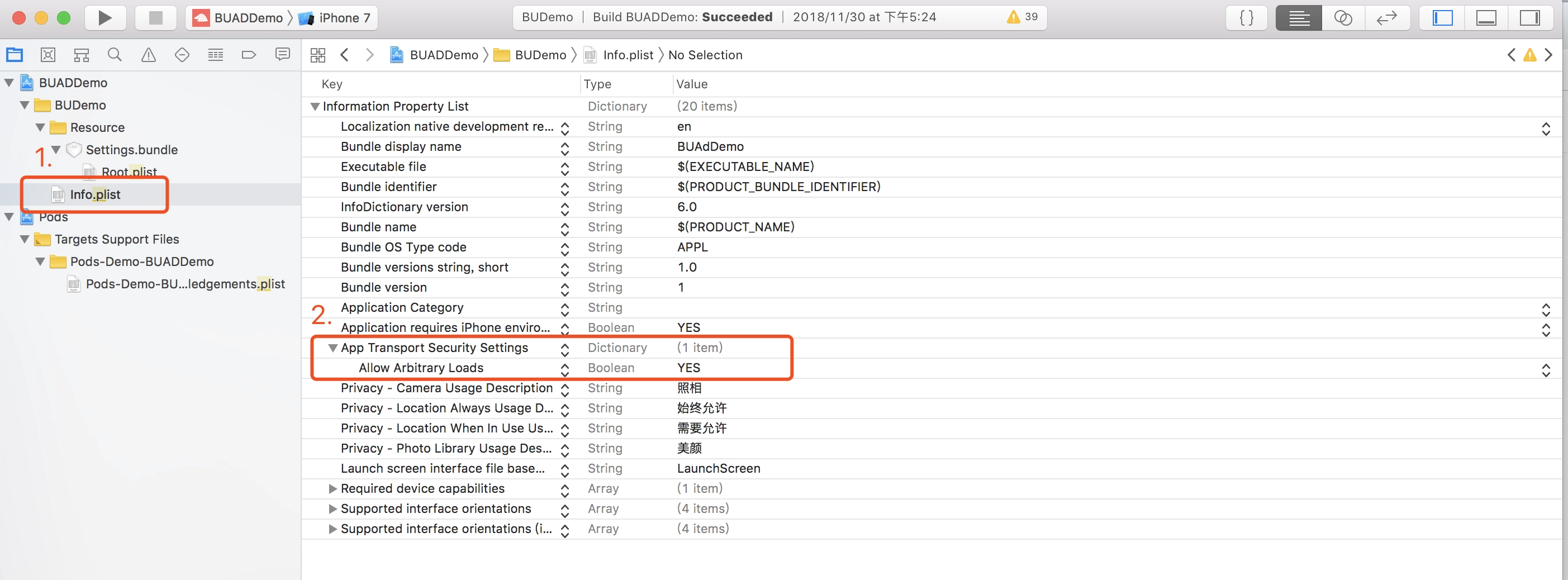 无论您使用cocoapods集成,手动集成或SPM集成穿山甲SDK,都可以在xcode项目CSJAdSDK.bundle目录下找到PrivacyInfo.xcprivacy文件,请将此文件拷贝进您的工程中。如果您的App本身包含PrivacyInfo.xcprivacy文件,请将穿山甲的PrivacyInfo.xcprivacy中的条款合并主文件中,方式如下: