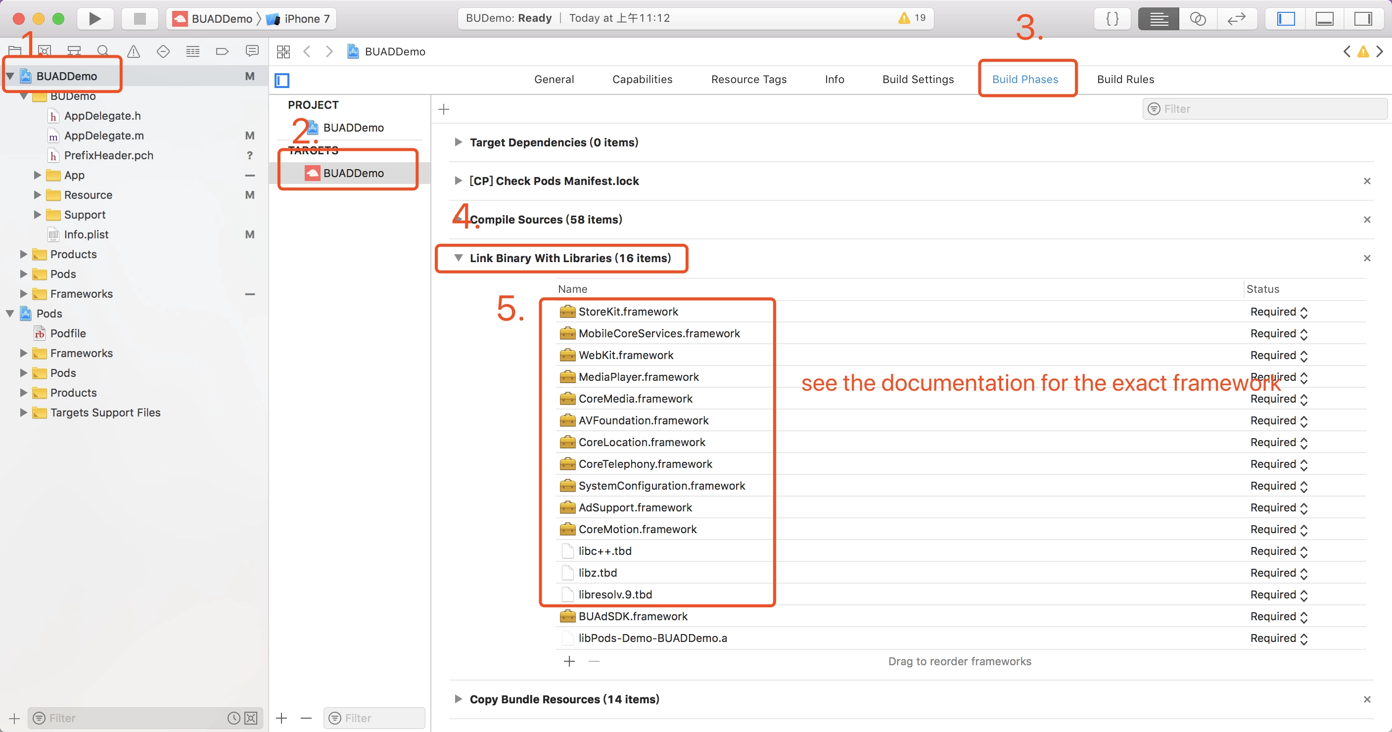 Xcode中选中工程,在Target->Build Phases->Link Binary With Libraries中点击“+”,点击“Add”依次添加下列依赖库