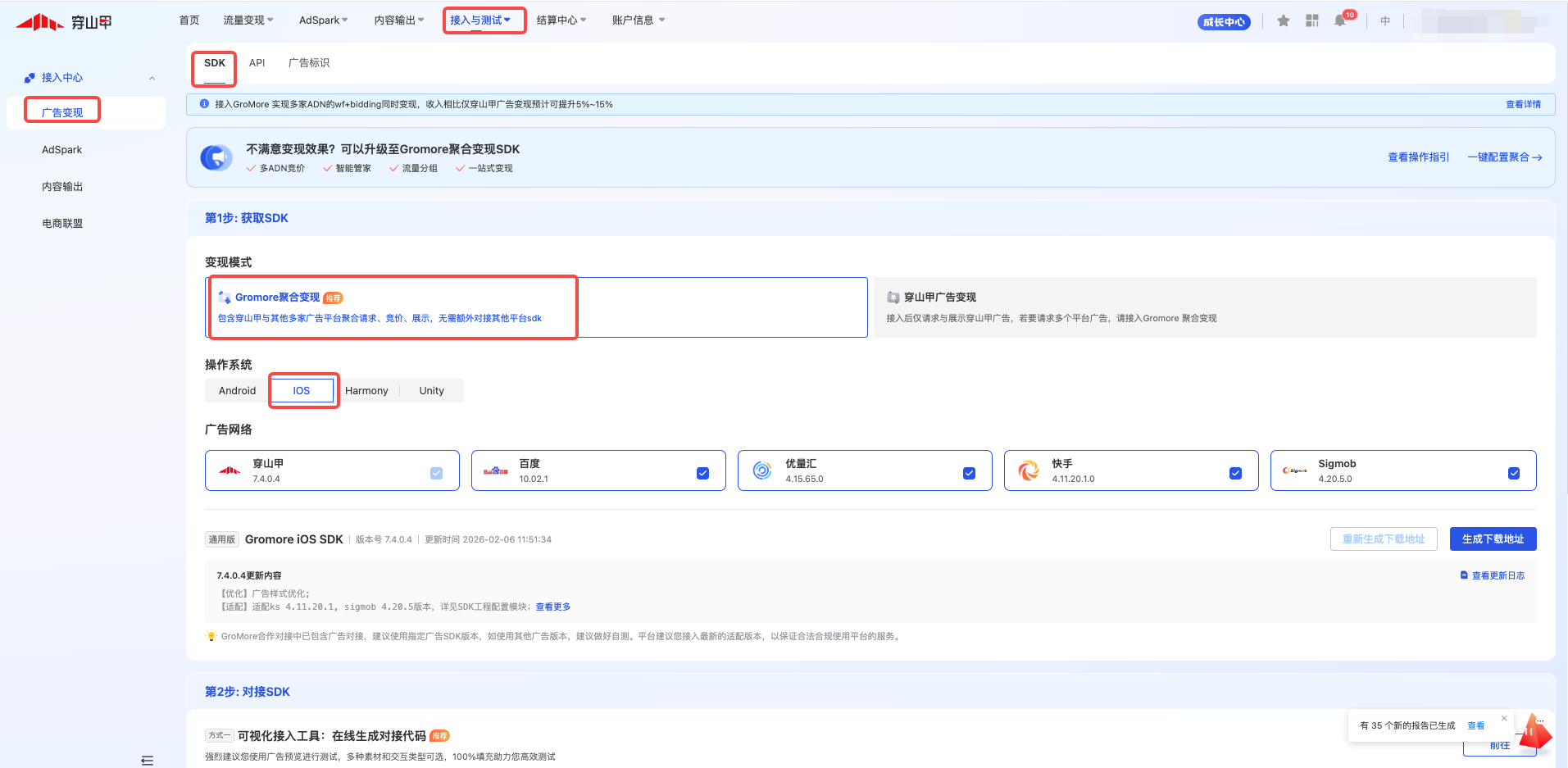 SDK包体可通过穿山甲媒体平台->接入中心->广告变现->->SDK->GroMore聚合变现下载即可。