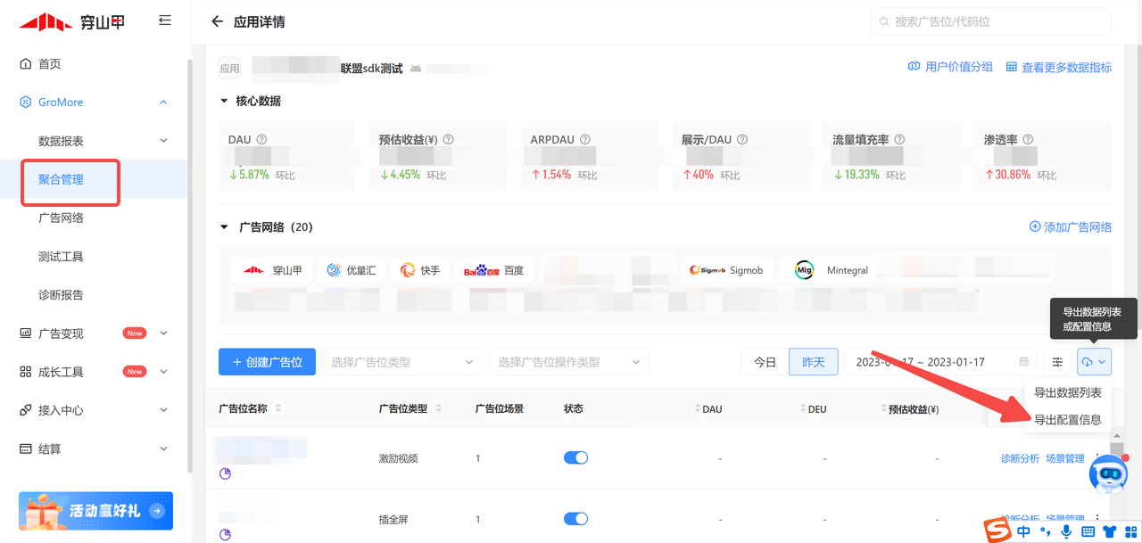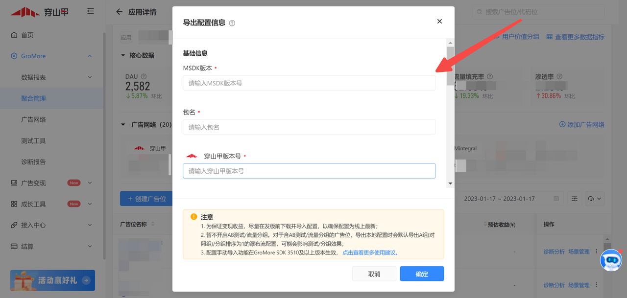 平台配置指引: 如下图所示,在应用详情页,下拉导出数据列表,点击“导出配置信息”,参考示例填写信息:MSDK版本号填写为融合SDK版本号、包名、穿山甲版本号填写为融合SDK版本号即可、其他ADN版本号后,即可完成配置信息导出。(聚合维度功能)