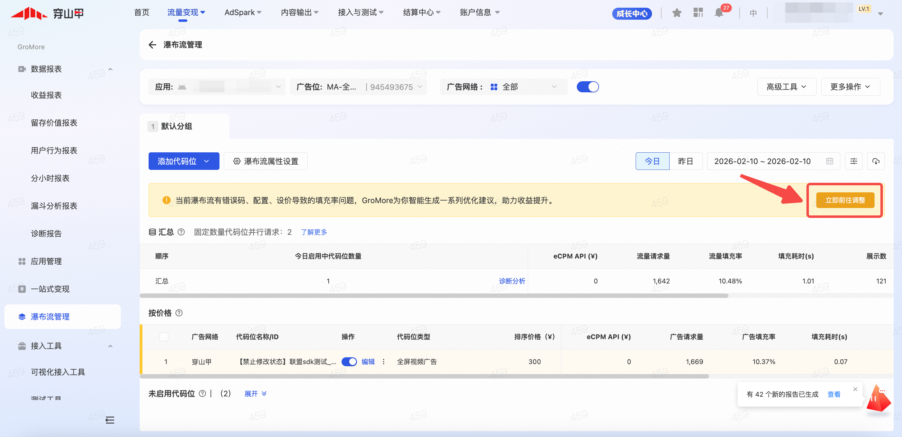 诊断报告是GroMore监控填充情况并诊断归因的分析工具,支持开发者查看每个应用的广告/流量填充失败情况,并披露广告位和代码位维度的错误码信息、分布及处理建议,用于快速识别和解决变现链路中的填充异常问题,提升收入及变现效率。