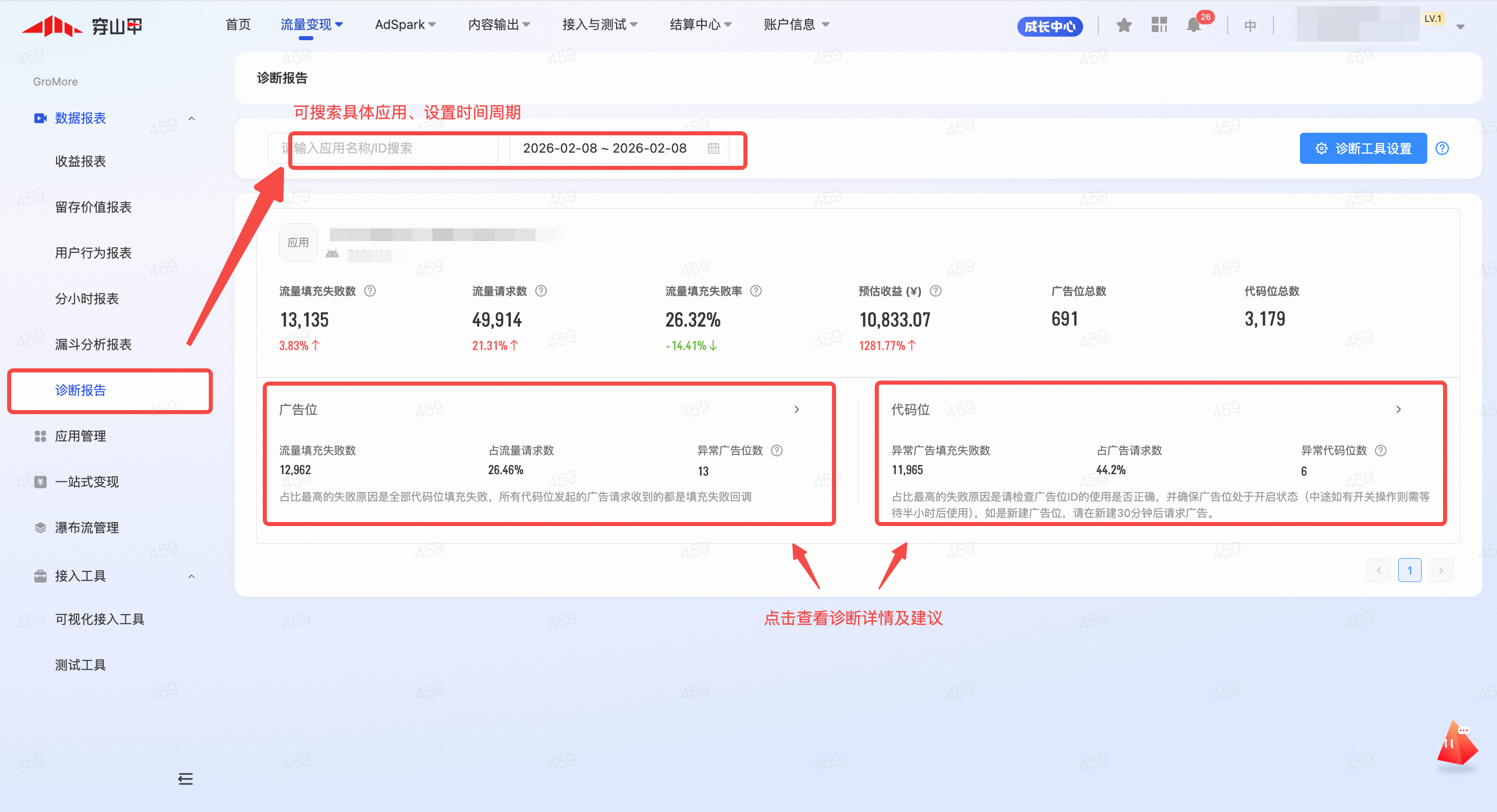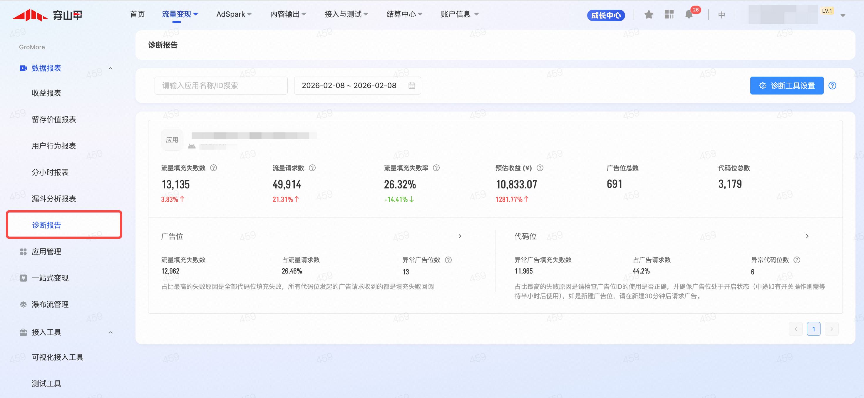 诊断报告首页可查看每个应用下自定义周期内的流量填充失败数、流量请求数、流量填充失败率、预估收益、广告位/代码位总数等核心指标及环比波动,为判断应用整体流量填充情况提供概览。