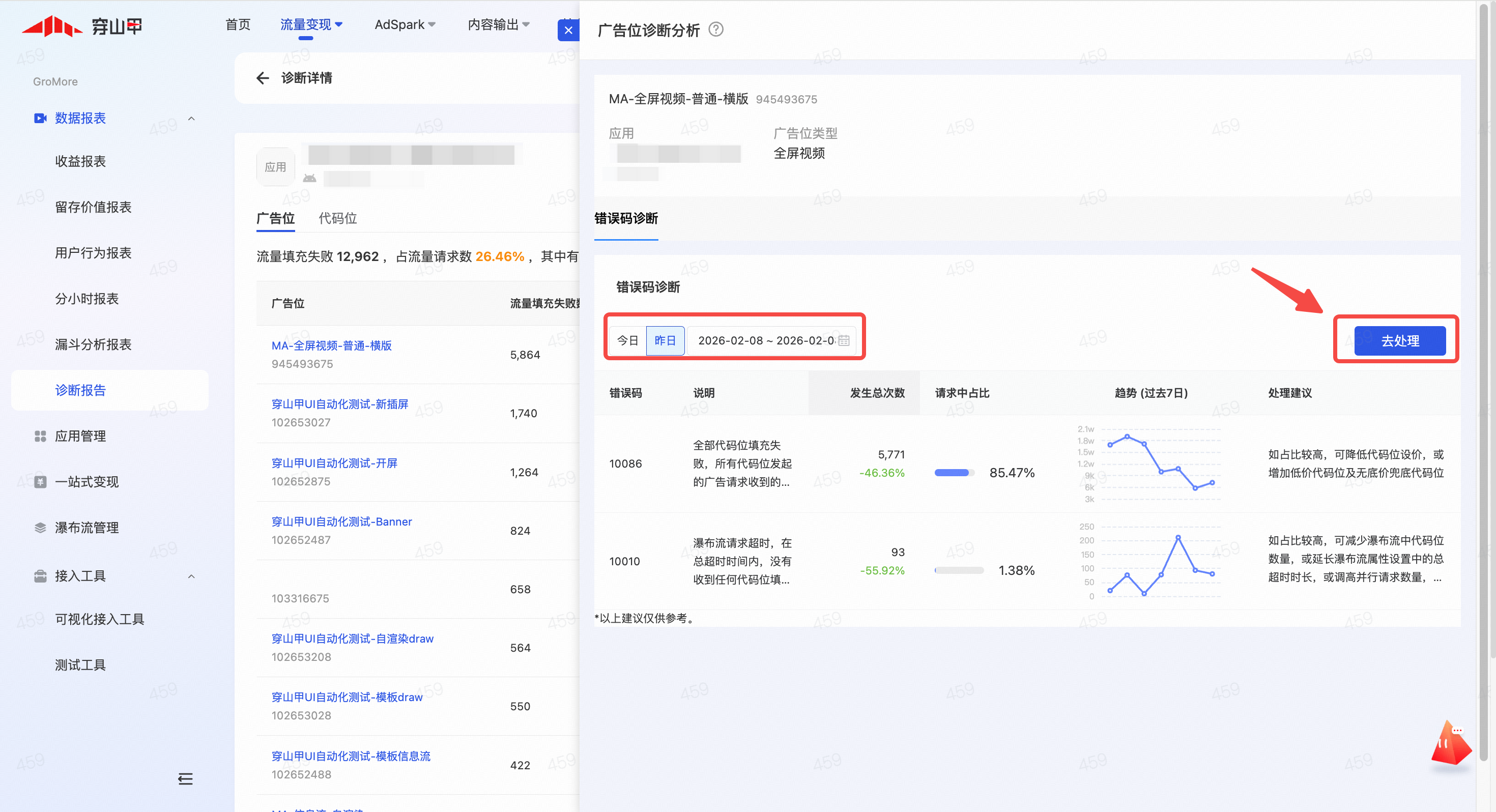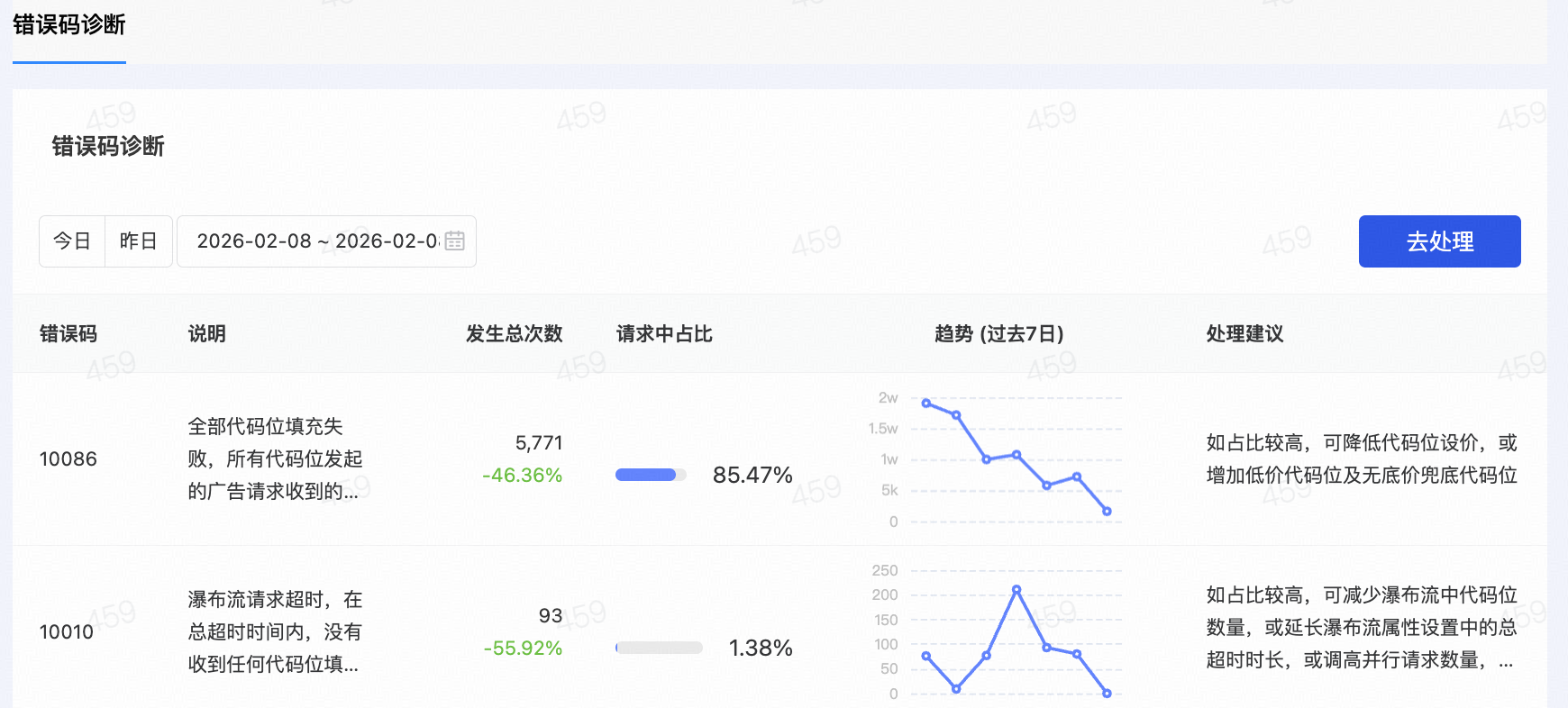诊断详情可细化至广告位/代码位维度,提供具体错误码诊断说明、发生次数与占比、趋势等信息并标注处理建议,便于开发者快速定位问题并进行优化调整。