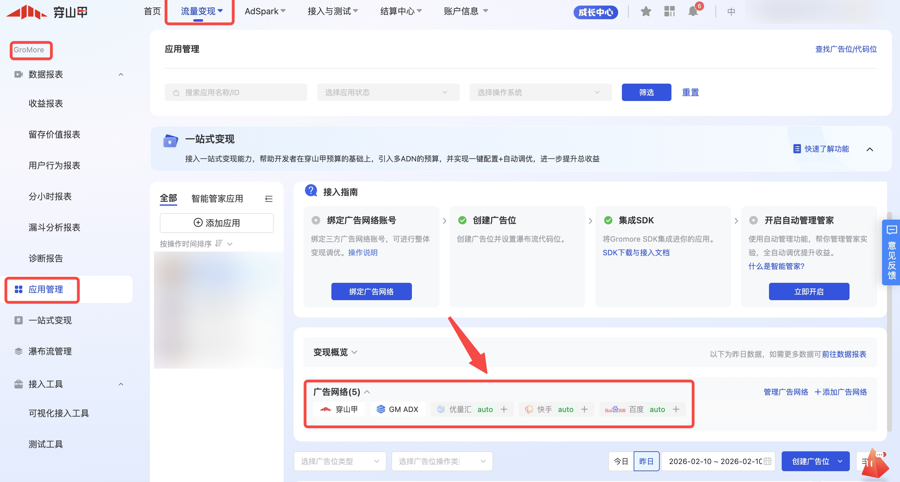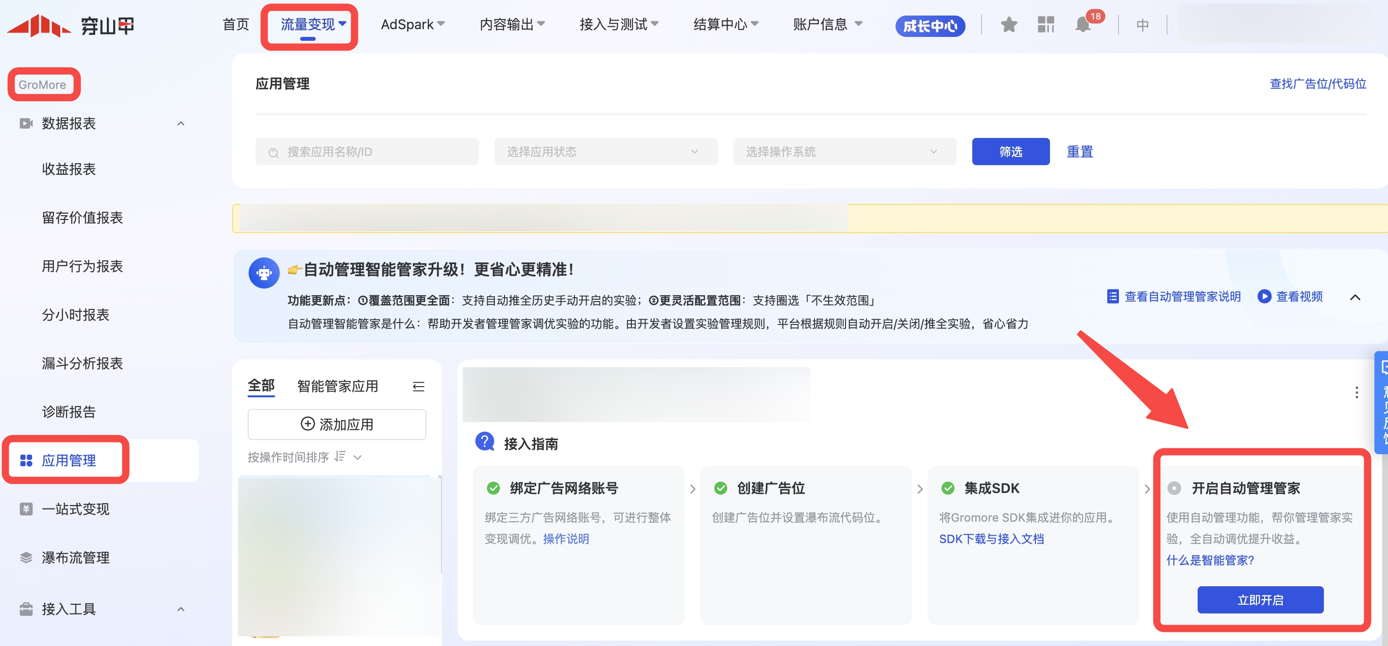 智能管家已全量开通,操作步骤:点击「流量变现」-「GroMore」-「应用管理」-「立即开启」,更多介绍详见 >>GroMore-智能管家-功能介绍