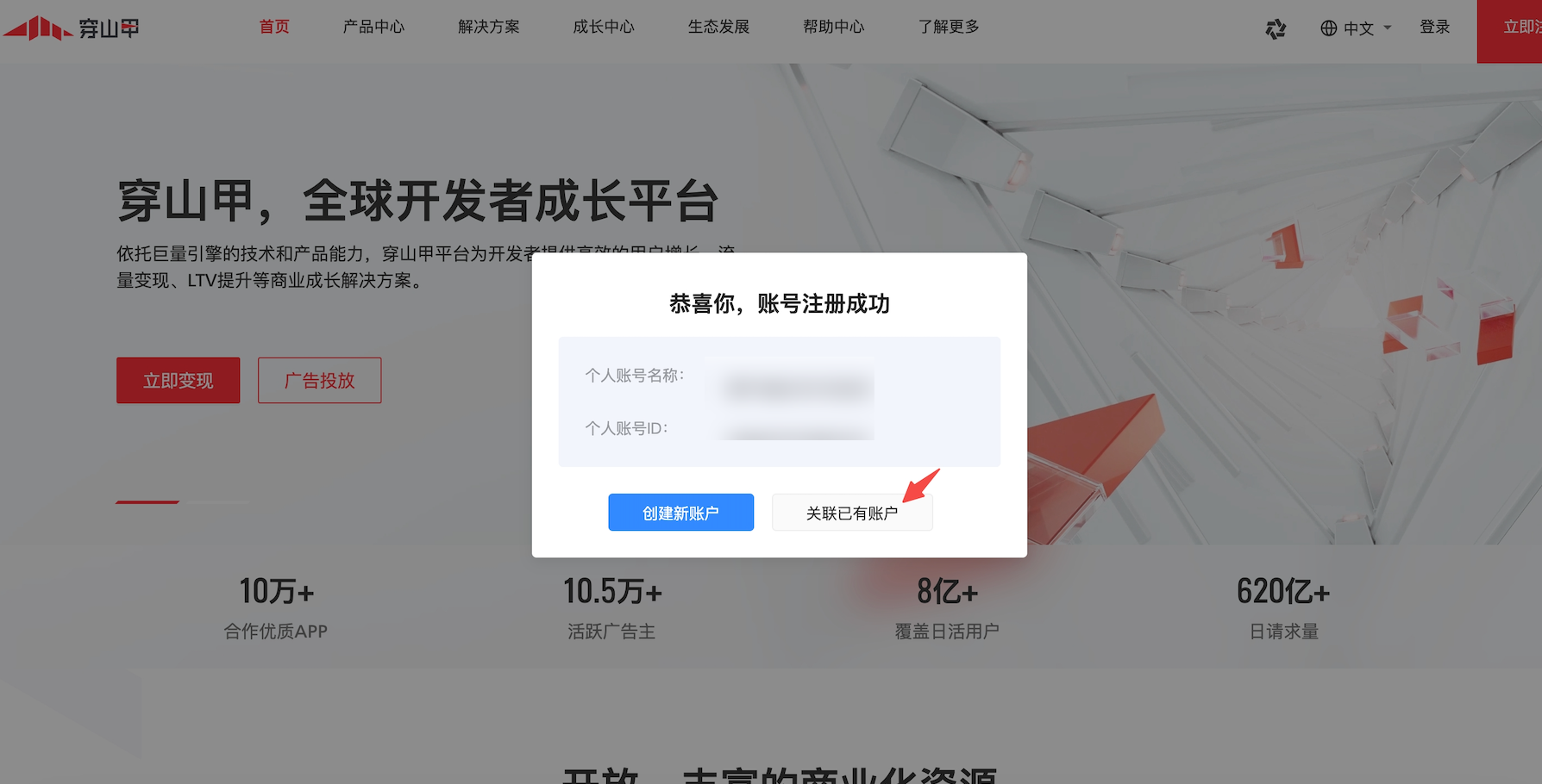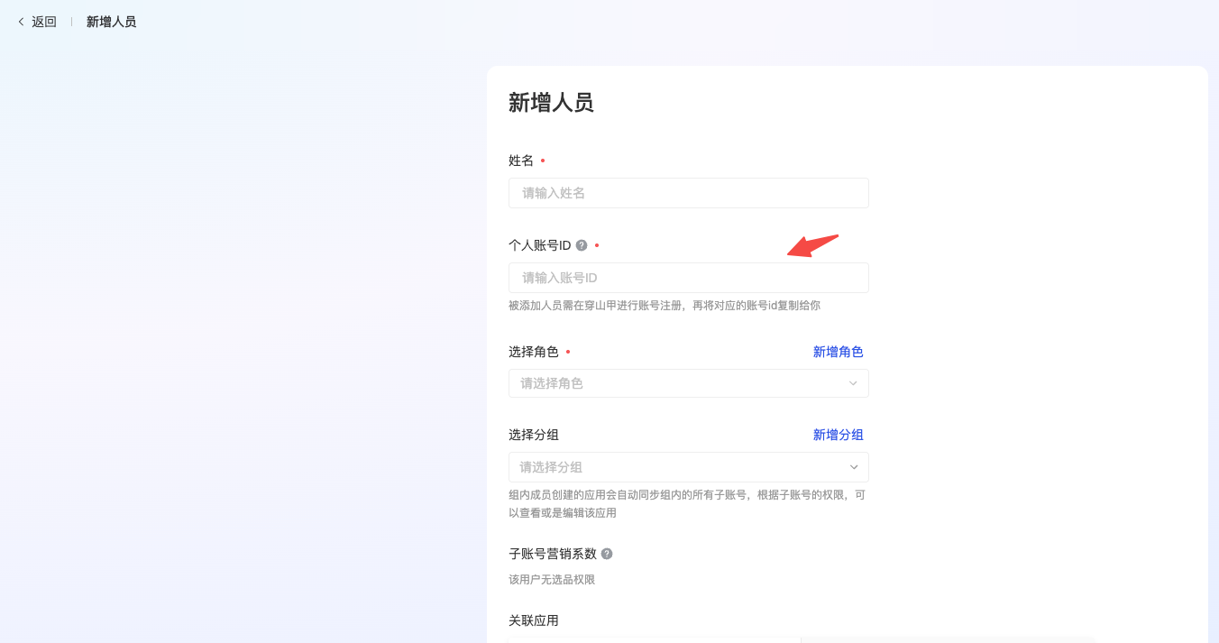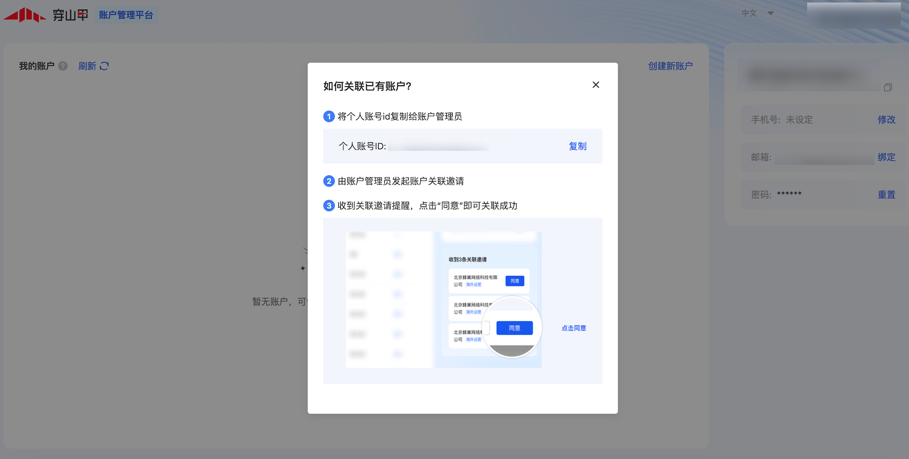 1.被邀请的人员需要先注册穿山甲,点击“关联已有账户”,然后将个人账号id复制给账户管理员