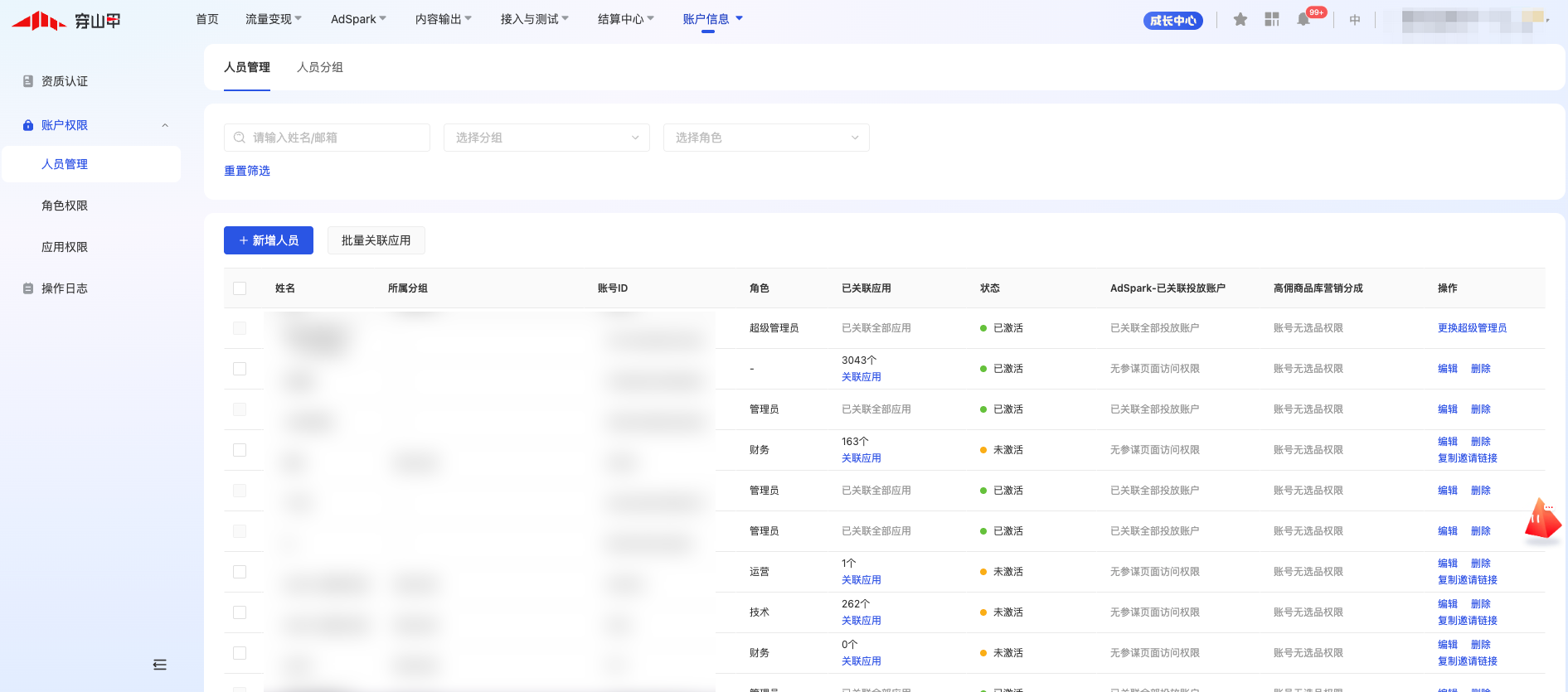 穿山甲平台全面升级了账户管理功能,新的账户管理功能中,如需邀请人员协作管理账户,需要用户先注册穿山甲平台,提供账号ID给管理员后由管理员添加