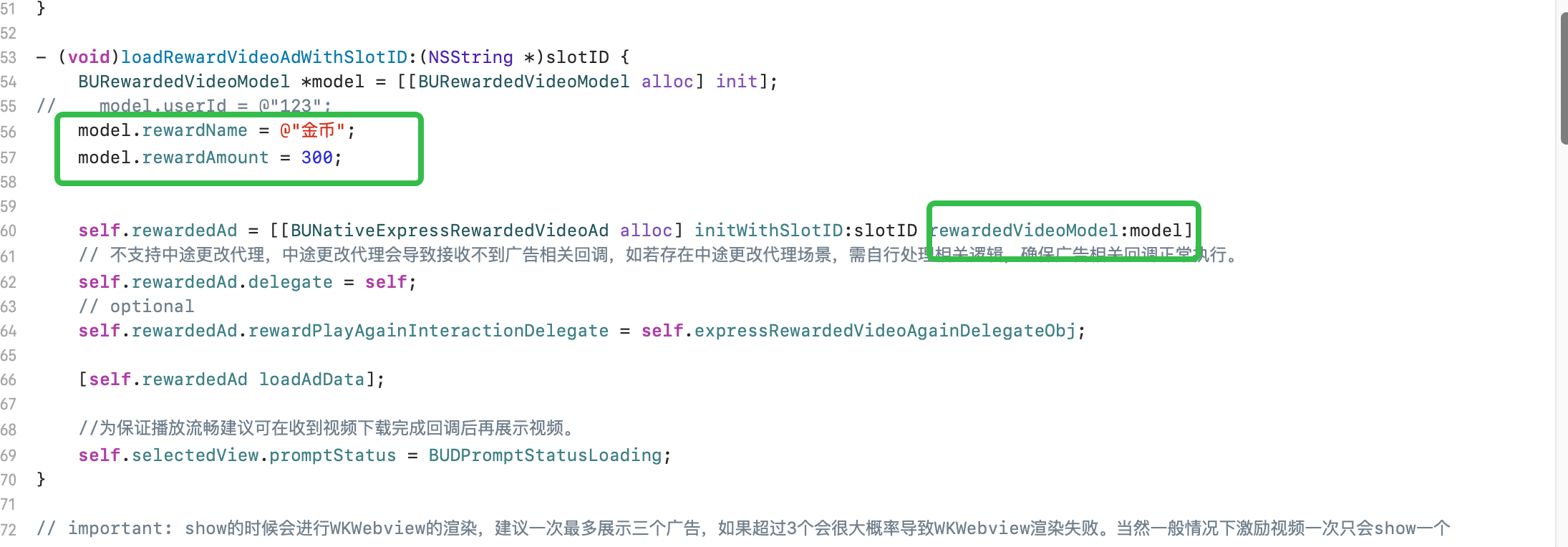详细接入可参照Demo中的BUDExpressRewardedVideoViewController类,广告加载请求部分可参照loadRewardVideoAdWithSlotID方法,广告展示部分可参照showRewardVideoAd方法