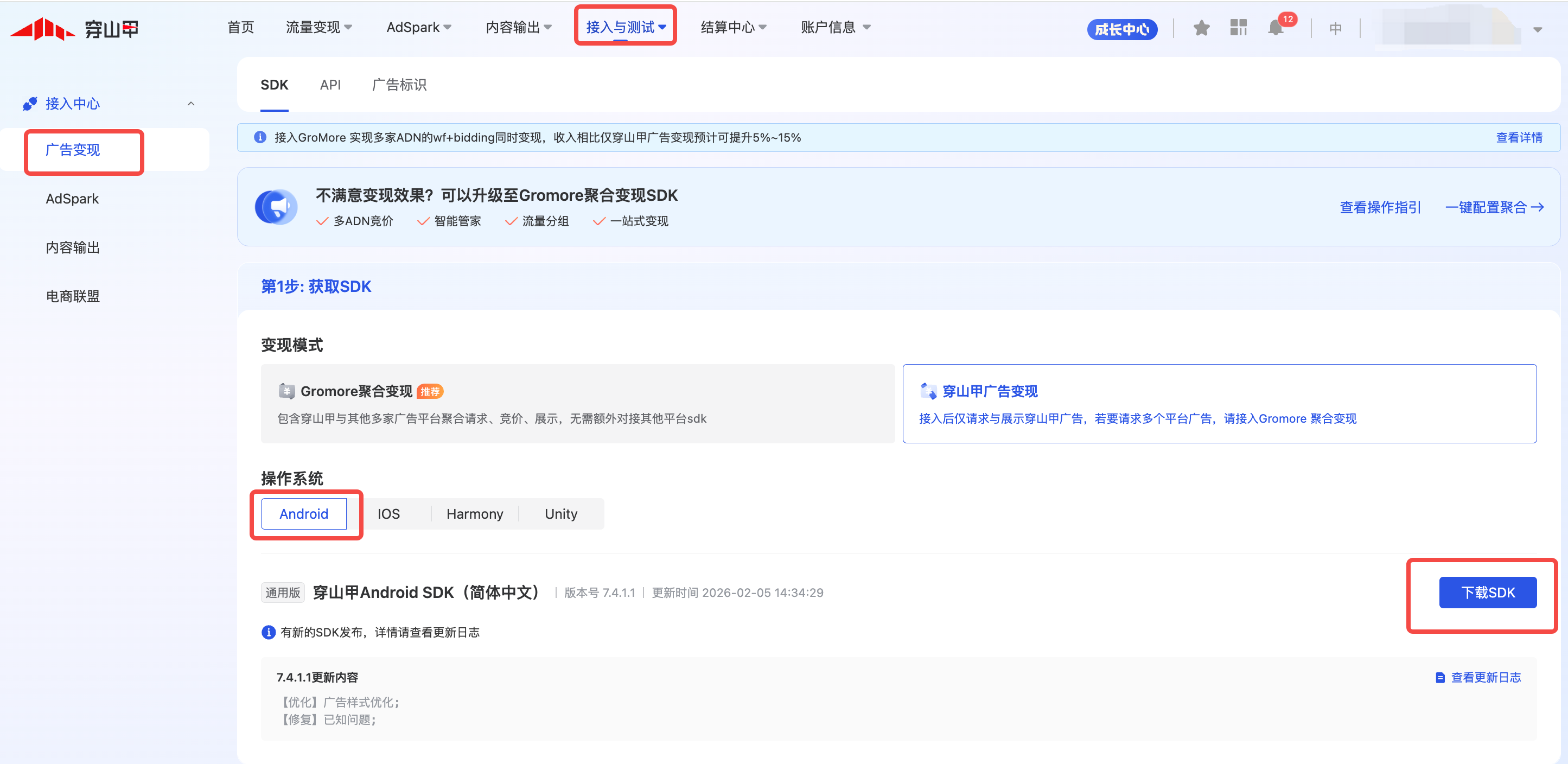 在开发者平台进入“接入与测试”-“广告变现”,可下载对应SDK并查看接入文档, 点击跳转