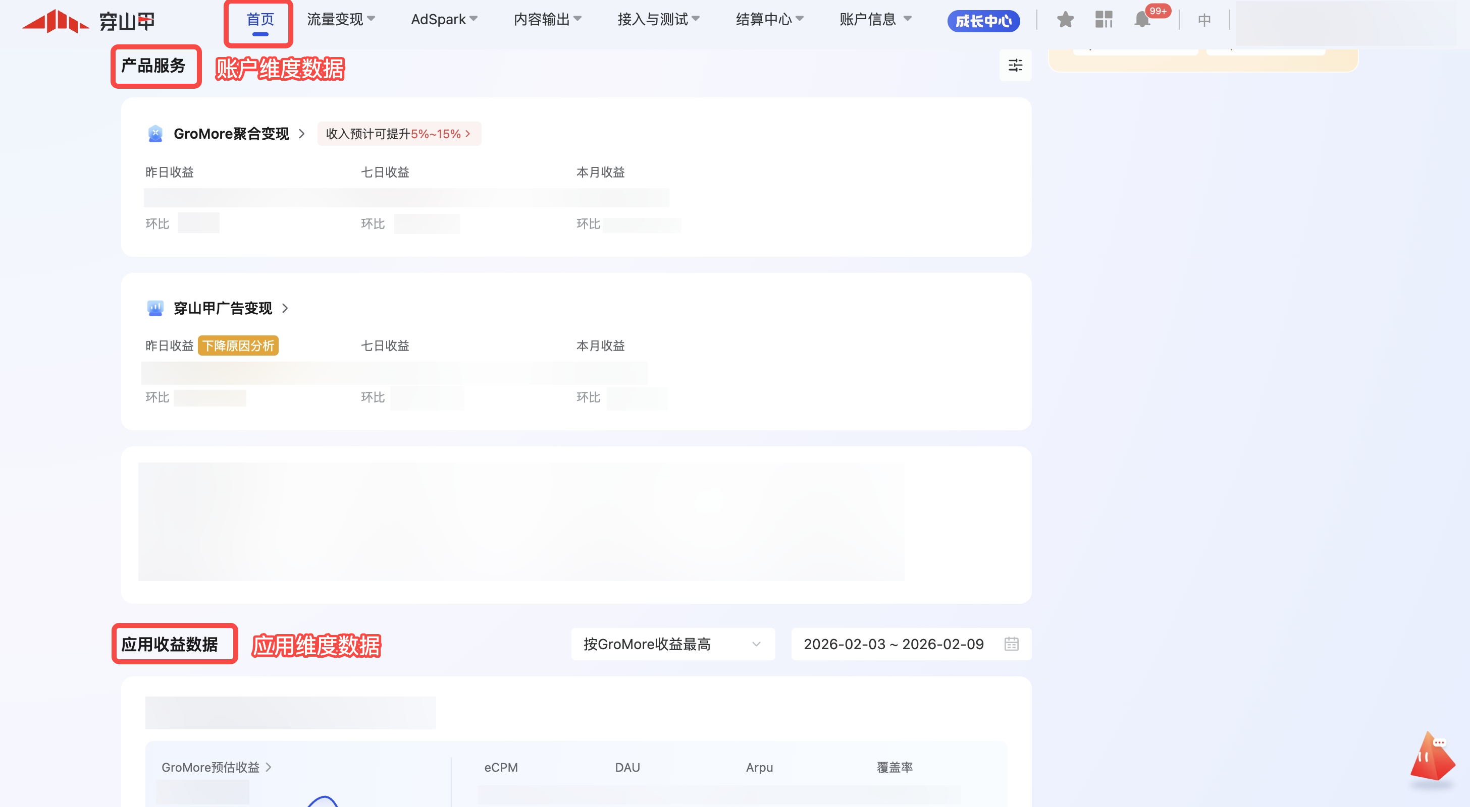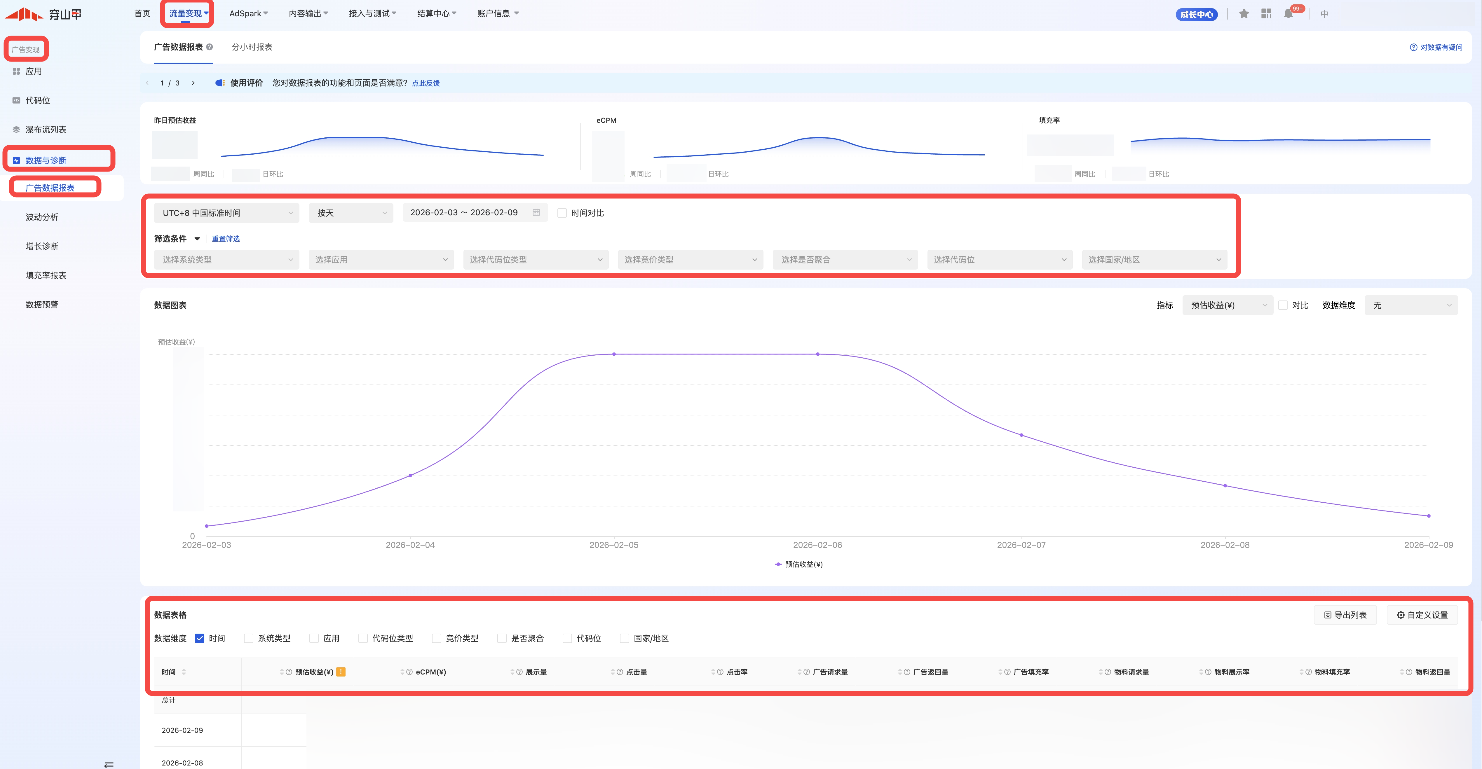 您可以在登录后的「首页」、「流量变现」-「广告变现」-「数据与诊断」-「广告数据报表」数据两个位置看到您账户、应用及代码位的相关数据。