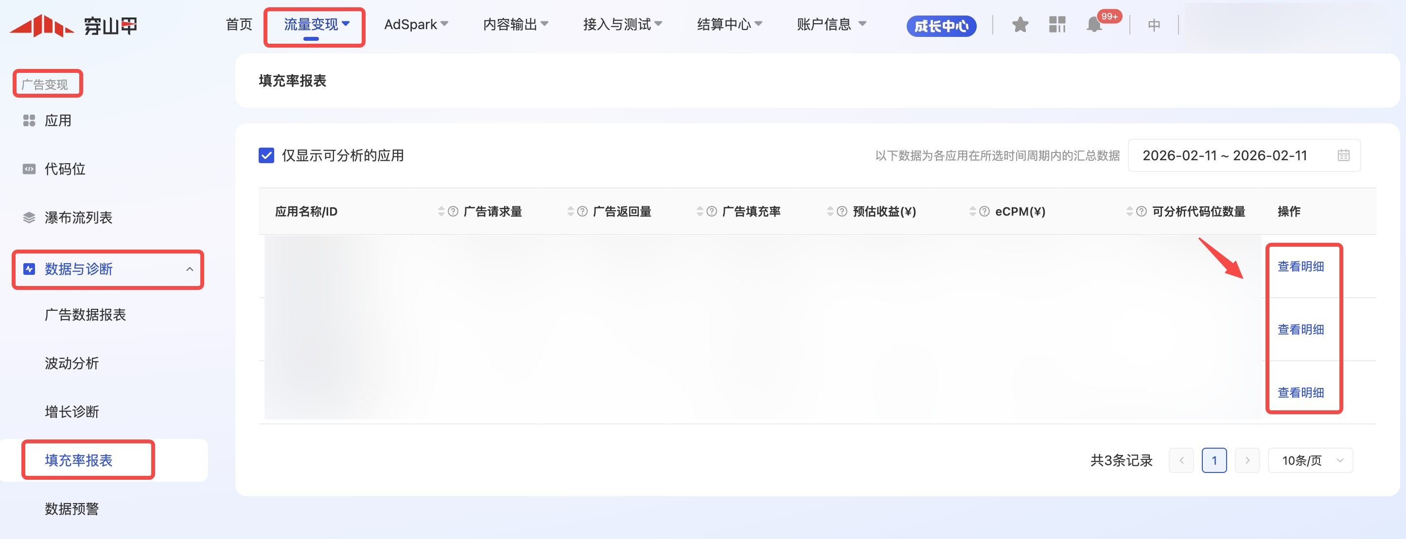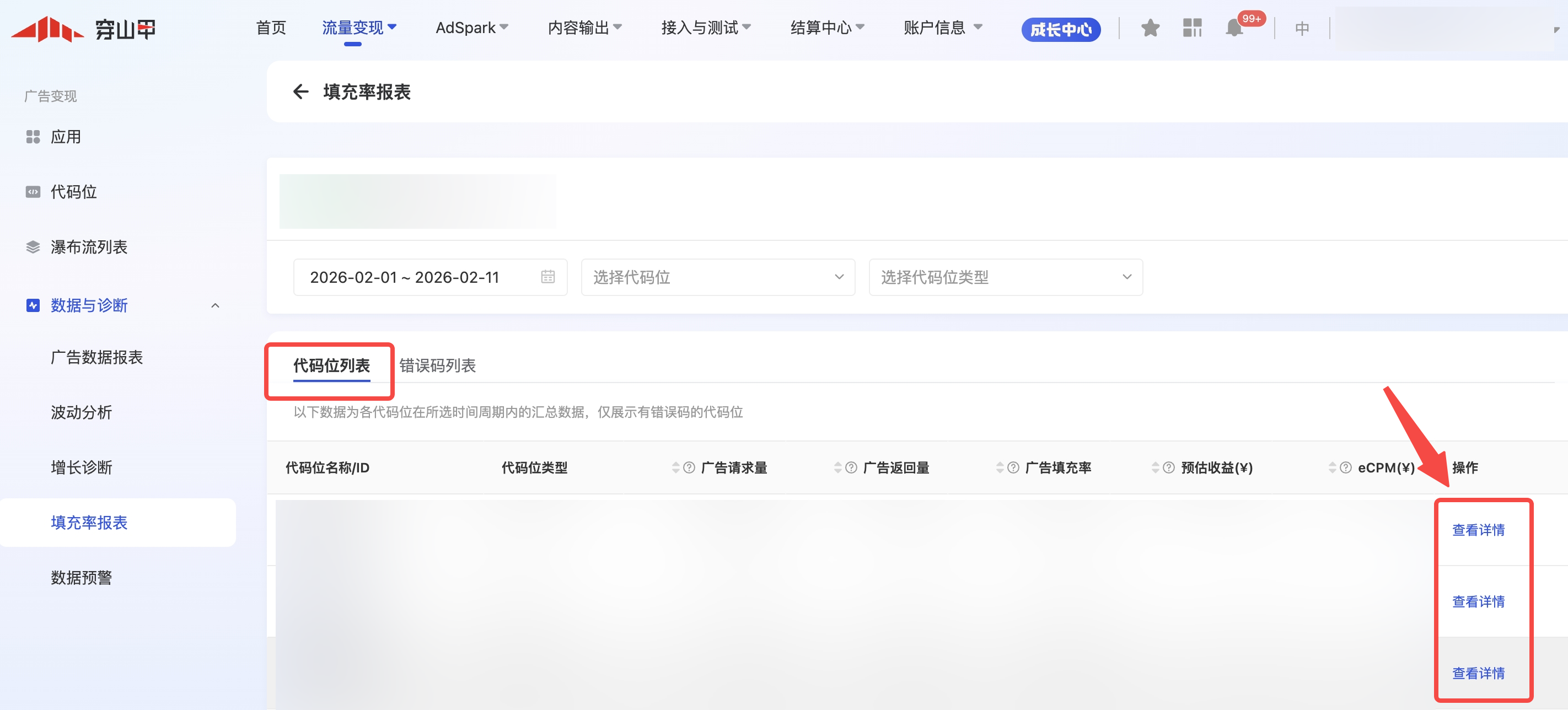 「流量变现」-「广告变现」-「数据与诊断」-「填充率报表」,即可查看。