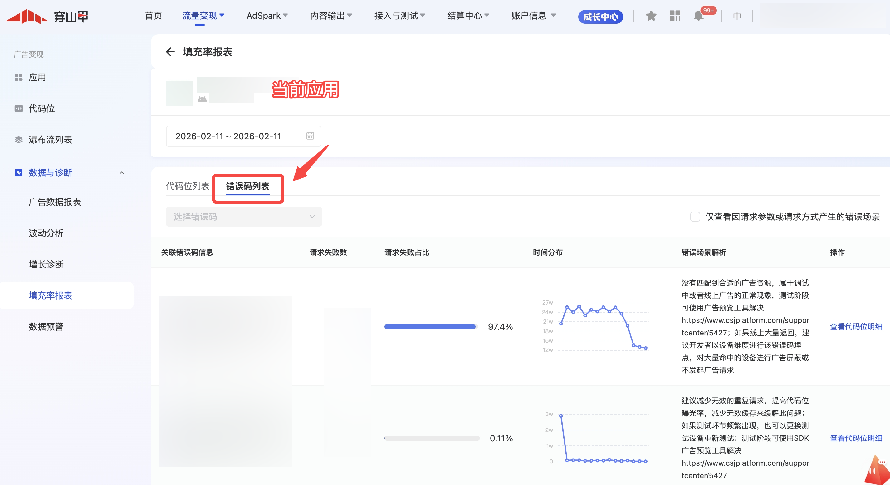 穿山甲平台上线填充率报表功能,开发者可通过此功能,查看代码位填充率异常的相关数据与诊断分析,快速定位到数据异常原因、获取优化建议,及时进行调整。
