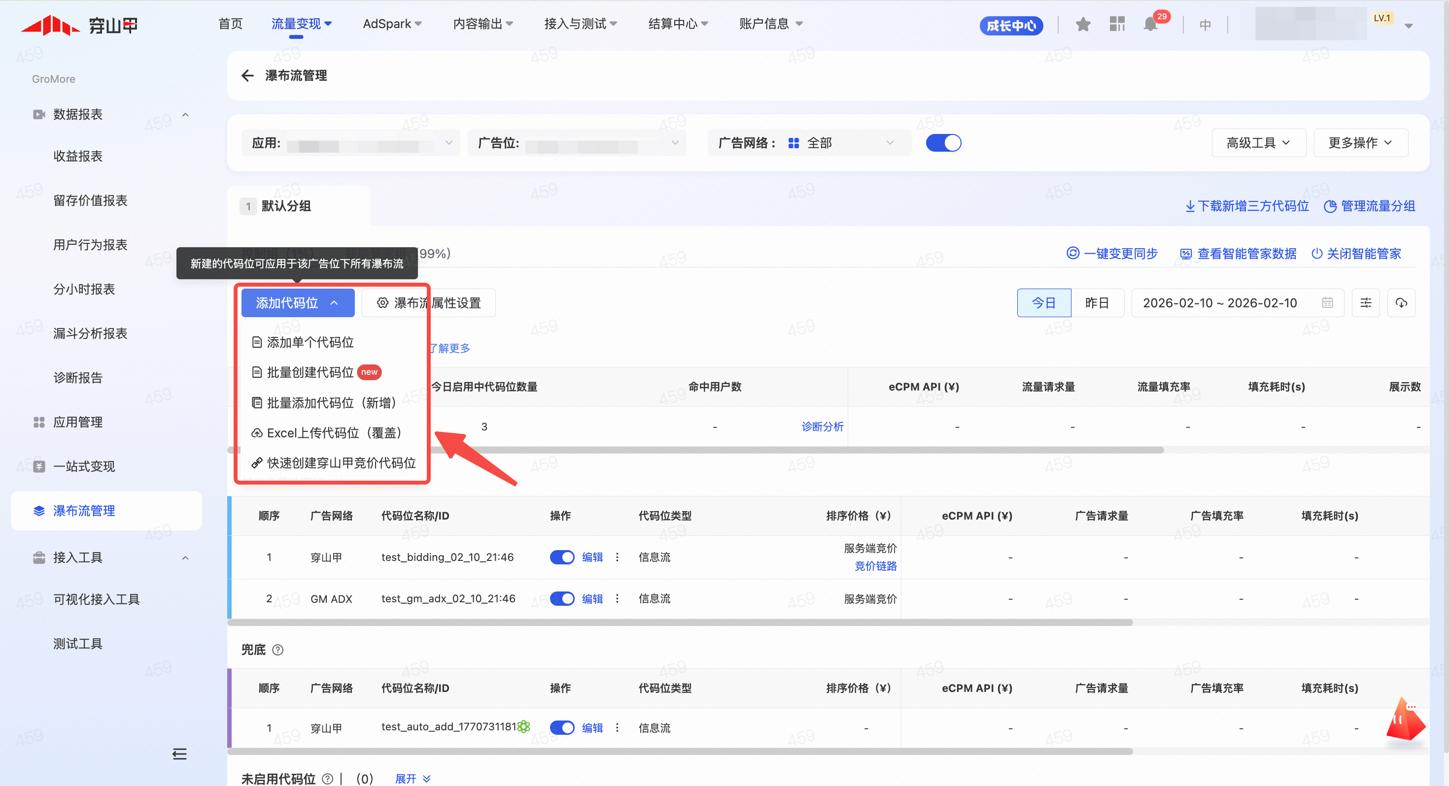 提示:平台支持批量创建代码位、批量添加代码位、Excel上传代码位、快速创建穿山甲Bidding代码位等快捷方式