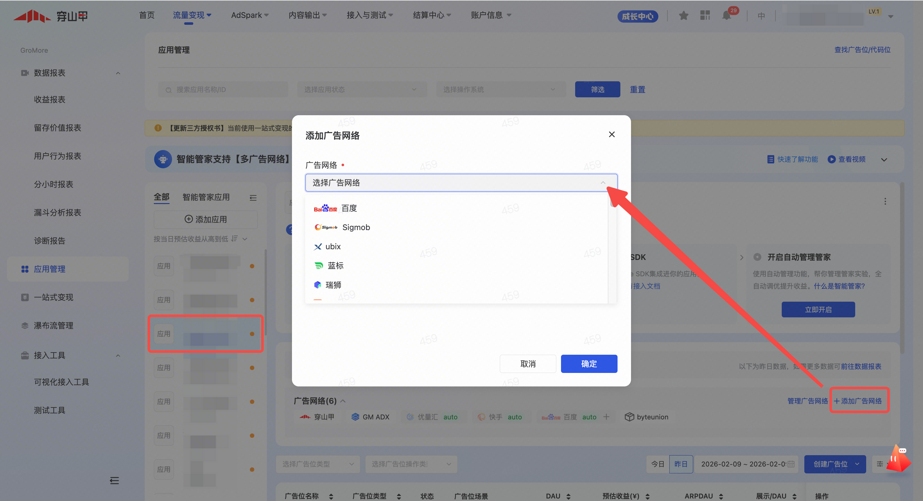 在【流量变现】->【GroMore】-> 【应用管理】页面中点击「添加应用」,在弹窗的搜索框中选择已经在穿山甲中添加的应用,或者快捷新建应用并添加,详细可参考应用创建说明文档。