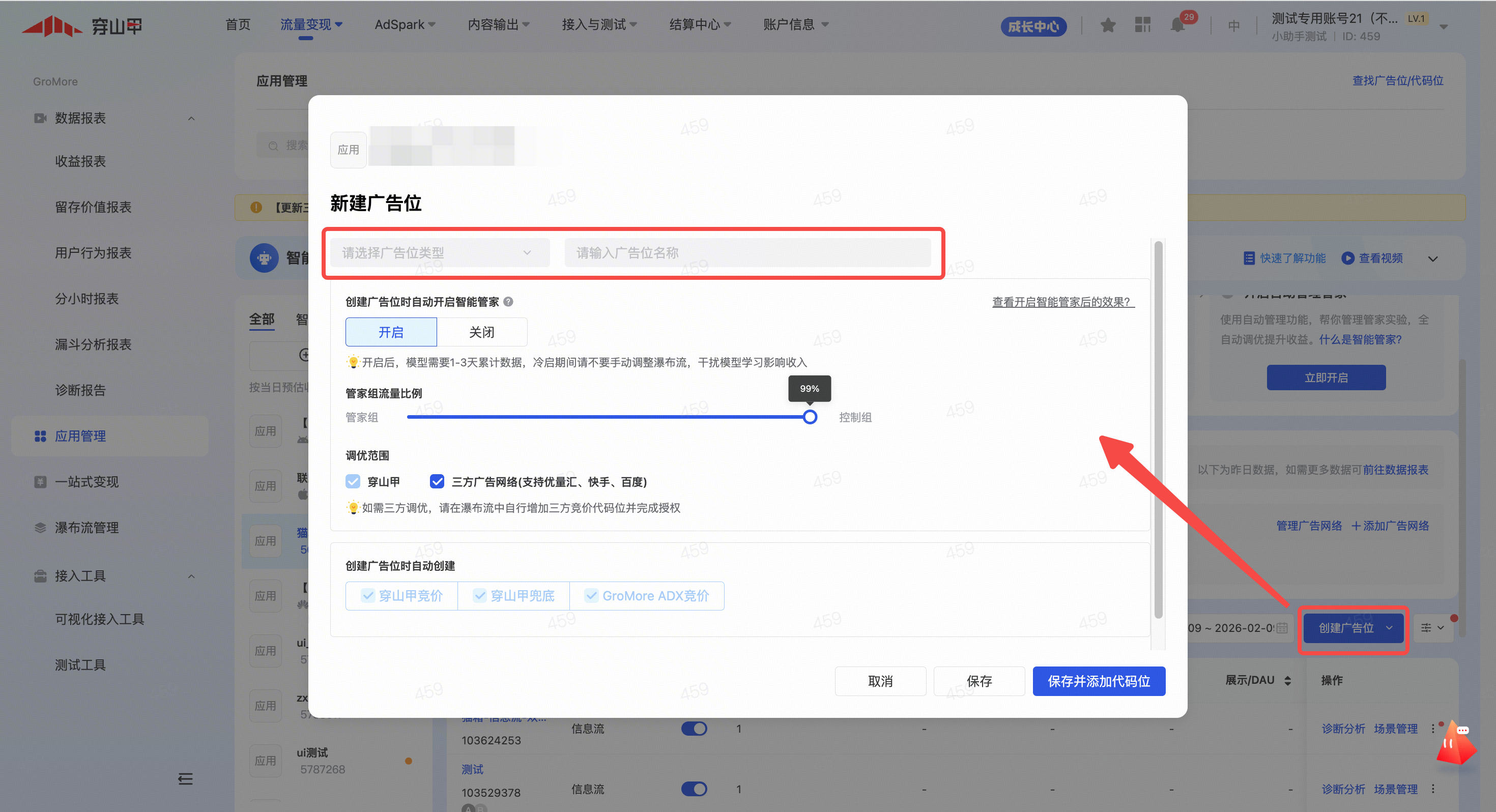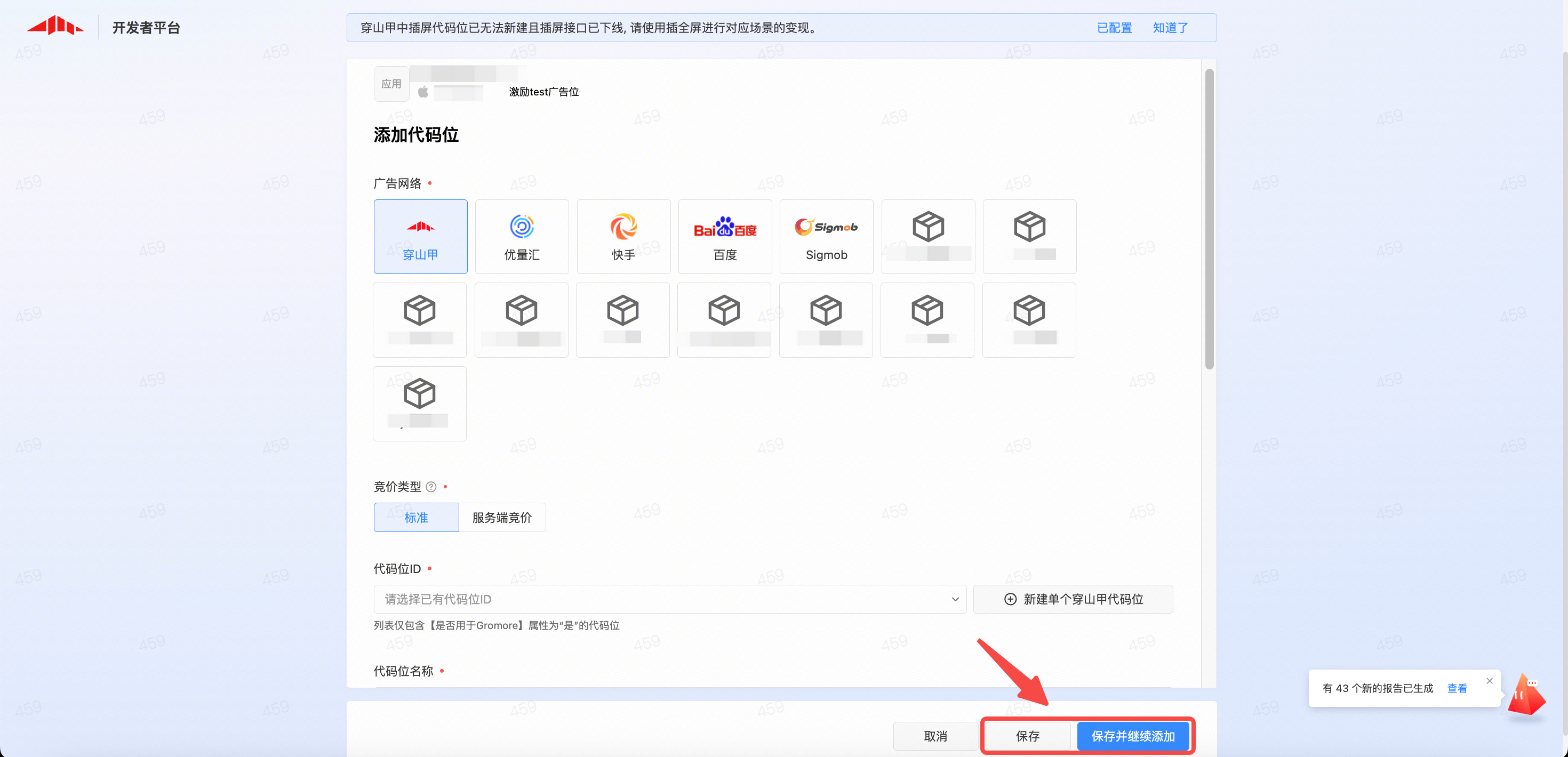 在添加好的应用下点击「创建广告位」,进入新建广告位页面,选择广告位类型,并对广告位进行命名并保存,可点击「保存并添加代码位」一键跳转至创建代码位页面。