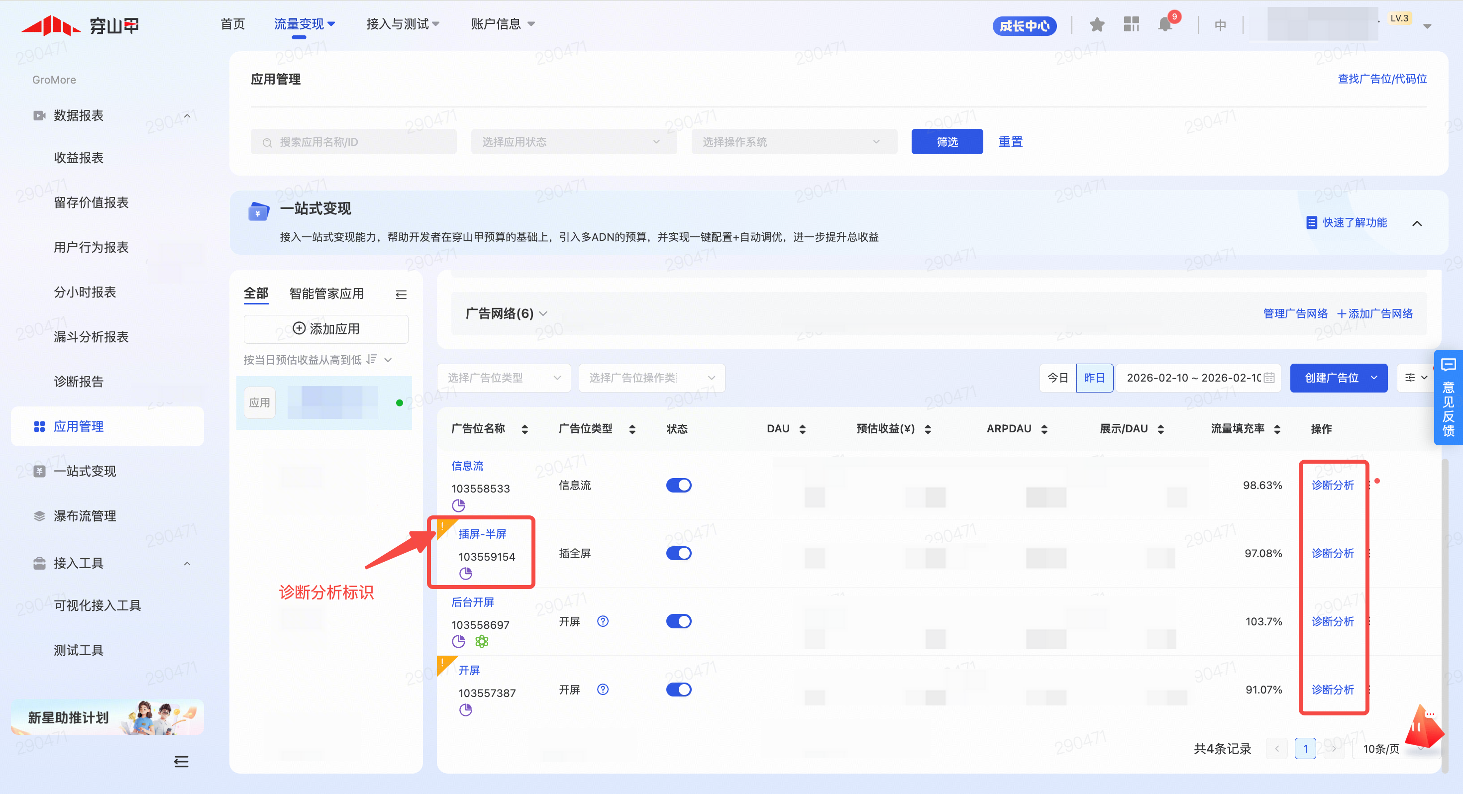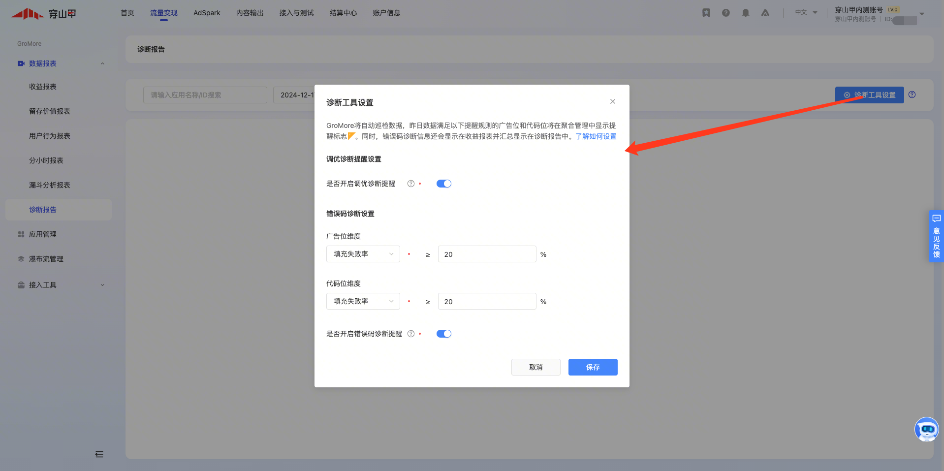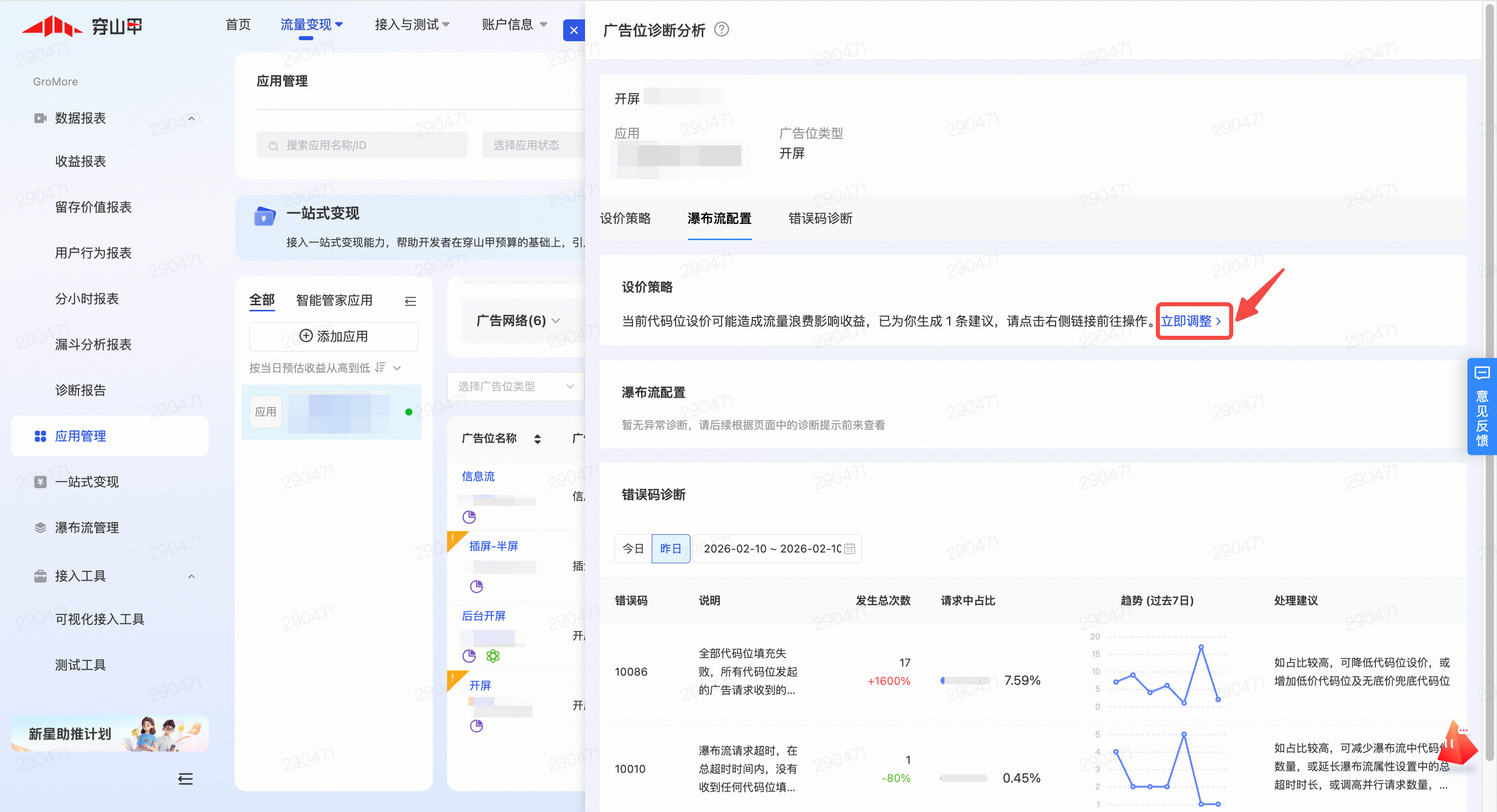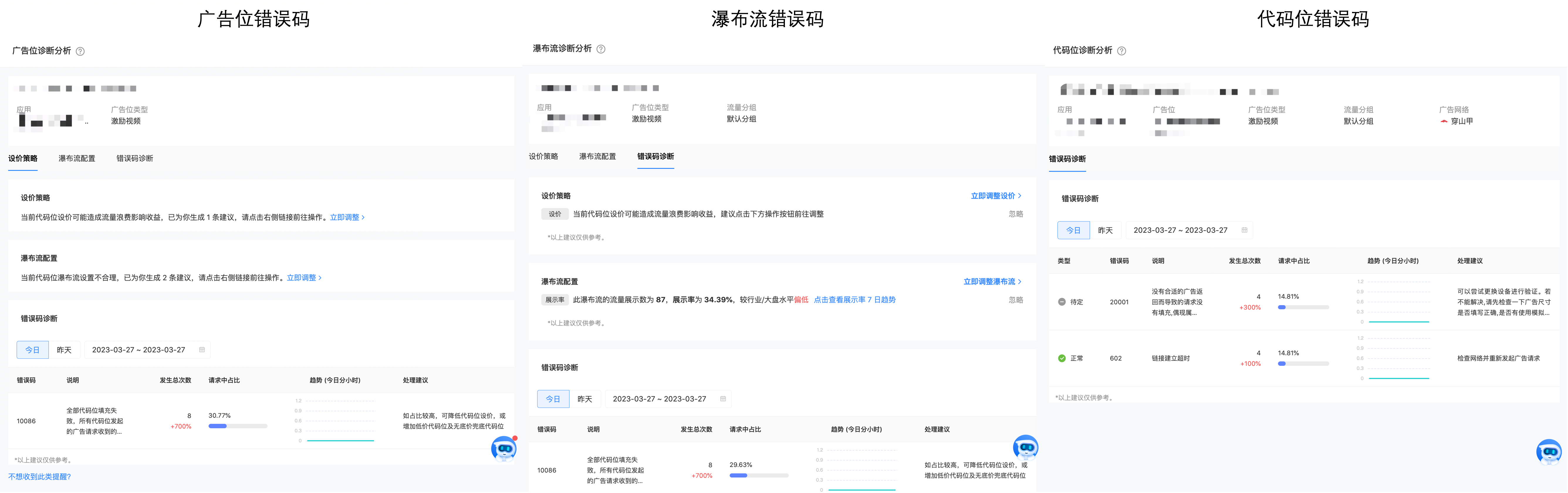错误码诊断 | 广告位/瀑布流/代码位 | 披露错误码信息,包括错误码说明、数量及占比、处理建议 |